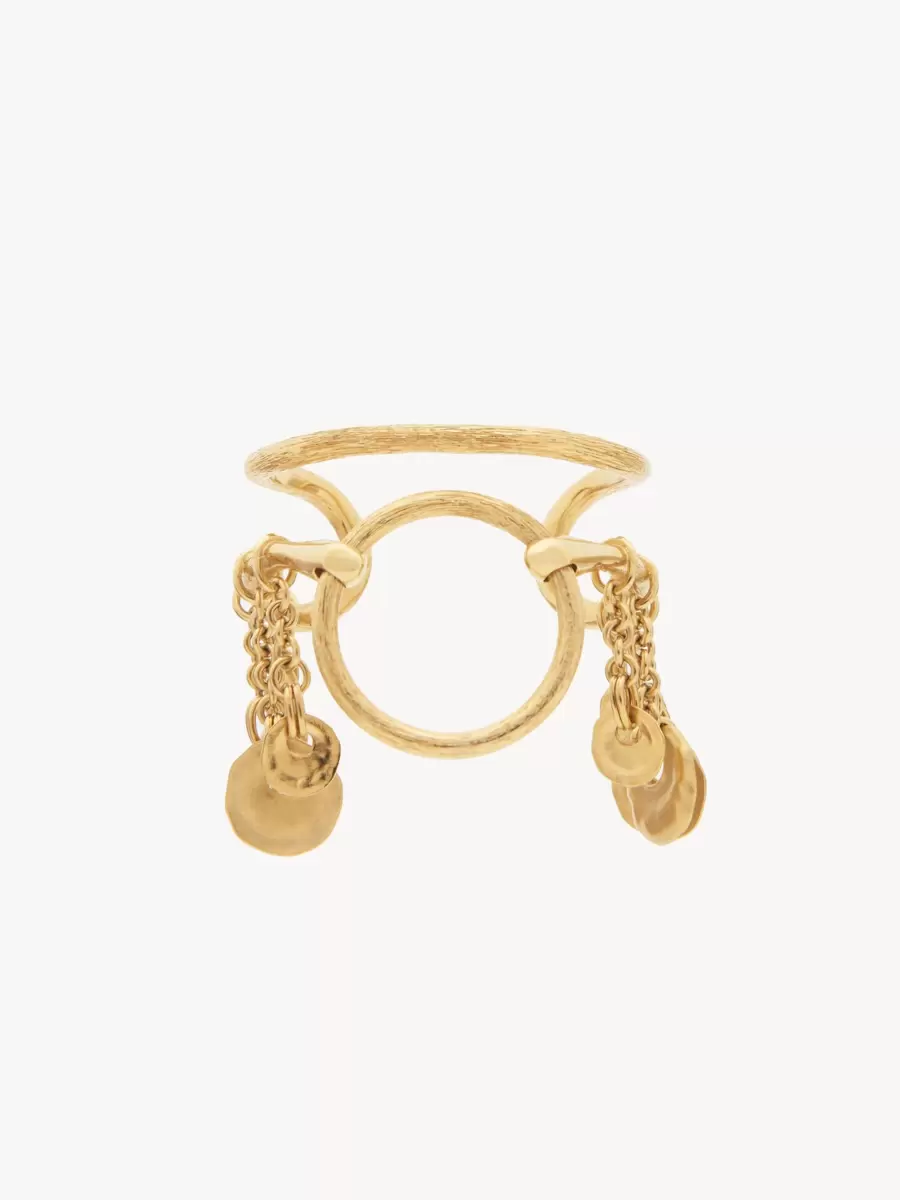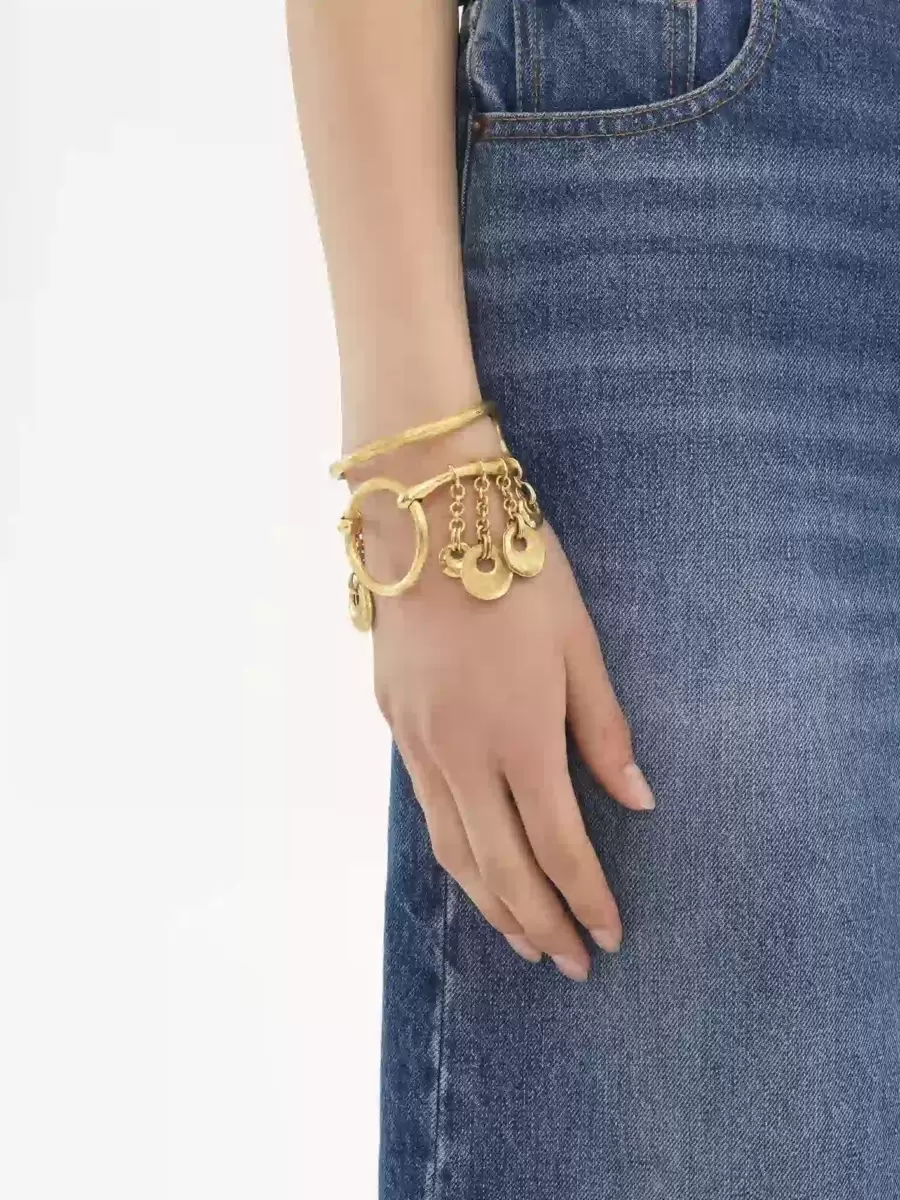 Chloé Eclectic armband i vintage guldmässing. Med släta, hamrade och borstade texturer med polerade och matta ytor har armbandet grafiska, böjda linjer och flera kronbladshängen på dinglande kedjor. En Chloé-logotypgravyr signerar detta smycke.