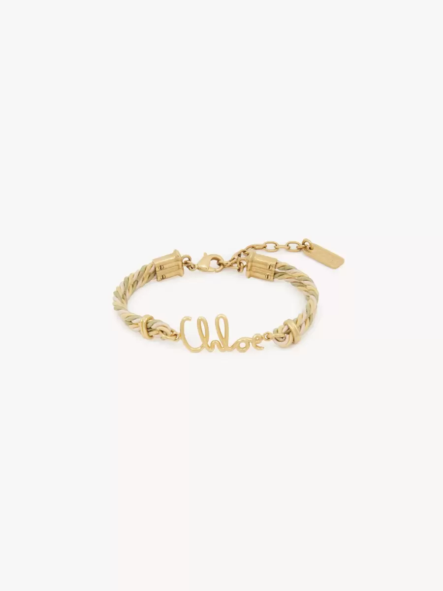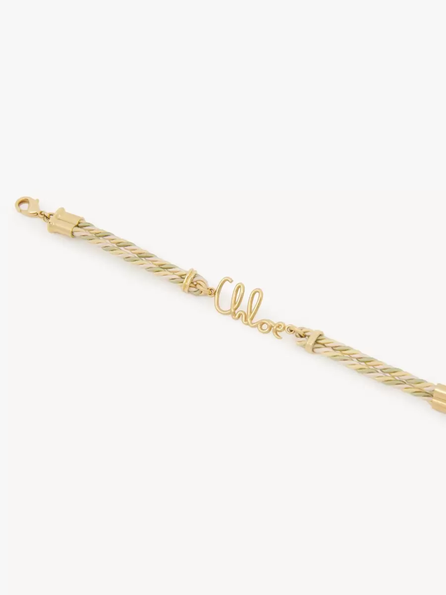Chloé Plage-armband i guldmässing med en dubbel flätad bomulls-viskos i pastellfärger. Inspirerat av Maisons arv pryder Chloés ikoniska signatur mitten. En guldfärgad Chloé-logotypplatta avslutar detta justerbara armband.