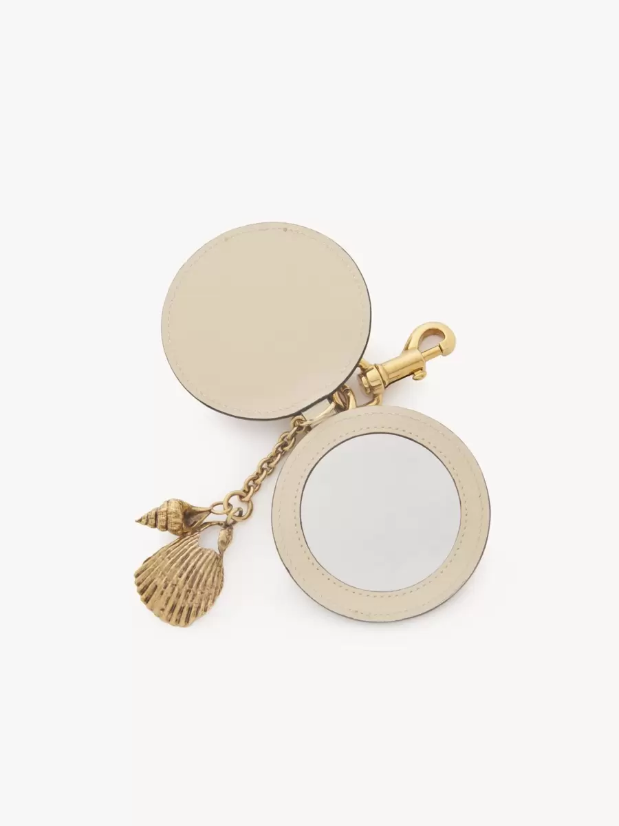 Denna runda spegelnyckelring är tillverkad av naturligt glänsande buffelläder och har ett mässingsspänne och en ring försedd med texturerade guldfärgade snäckberlocker.