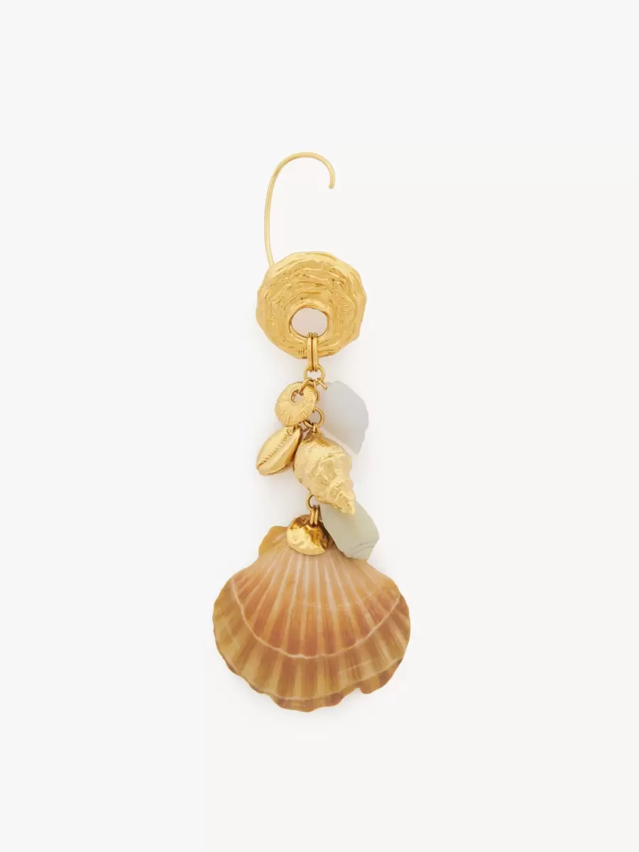 Chloé Shells monoörhänge i vintage guldmässing och harts. Beläget på en kedja som hänger från en hamrad guldmässingslänk, kombineras ett stort hartssnäcke med en mängd mindre snäckskalhängen i olika former och texturer. En Chloé-logotypgravyr signerar detta smycke.