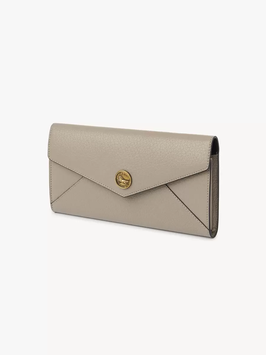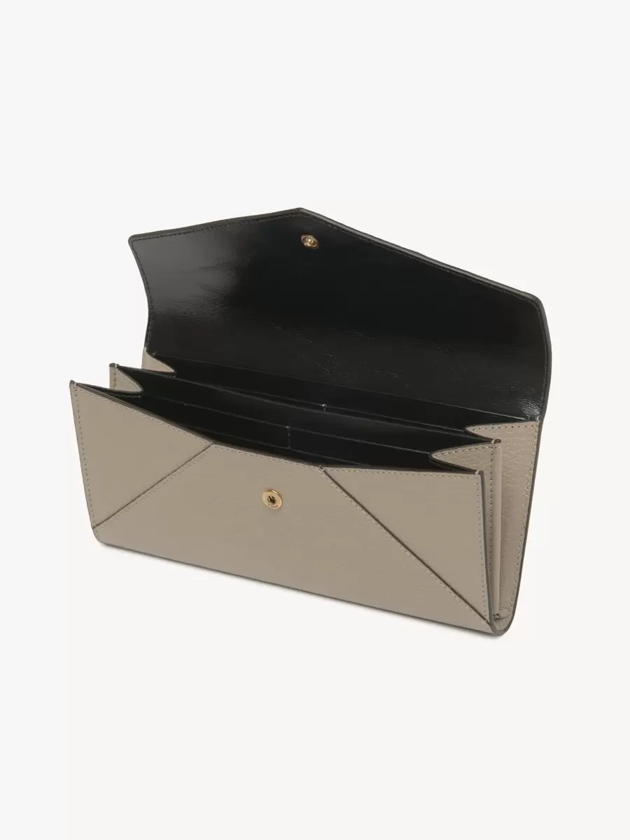 Denna långa kuvertplånbok med lock är tillverkad av narvat getskinn och har två huvudfack, 12 kortfack och en ytterficka med dragkedja.