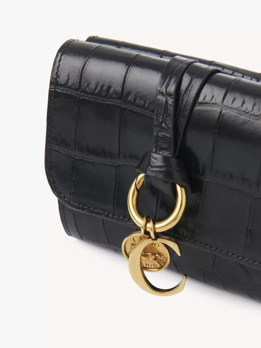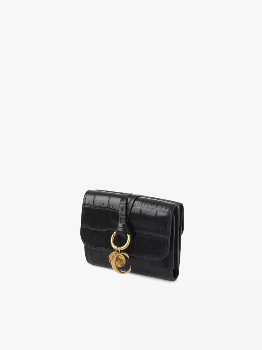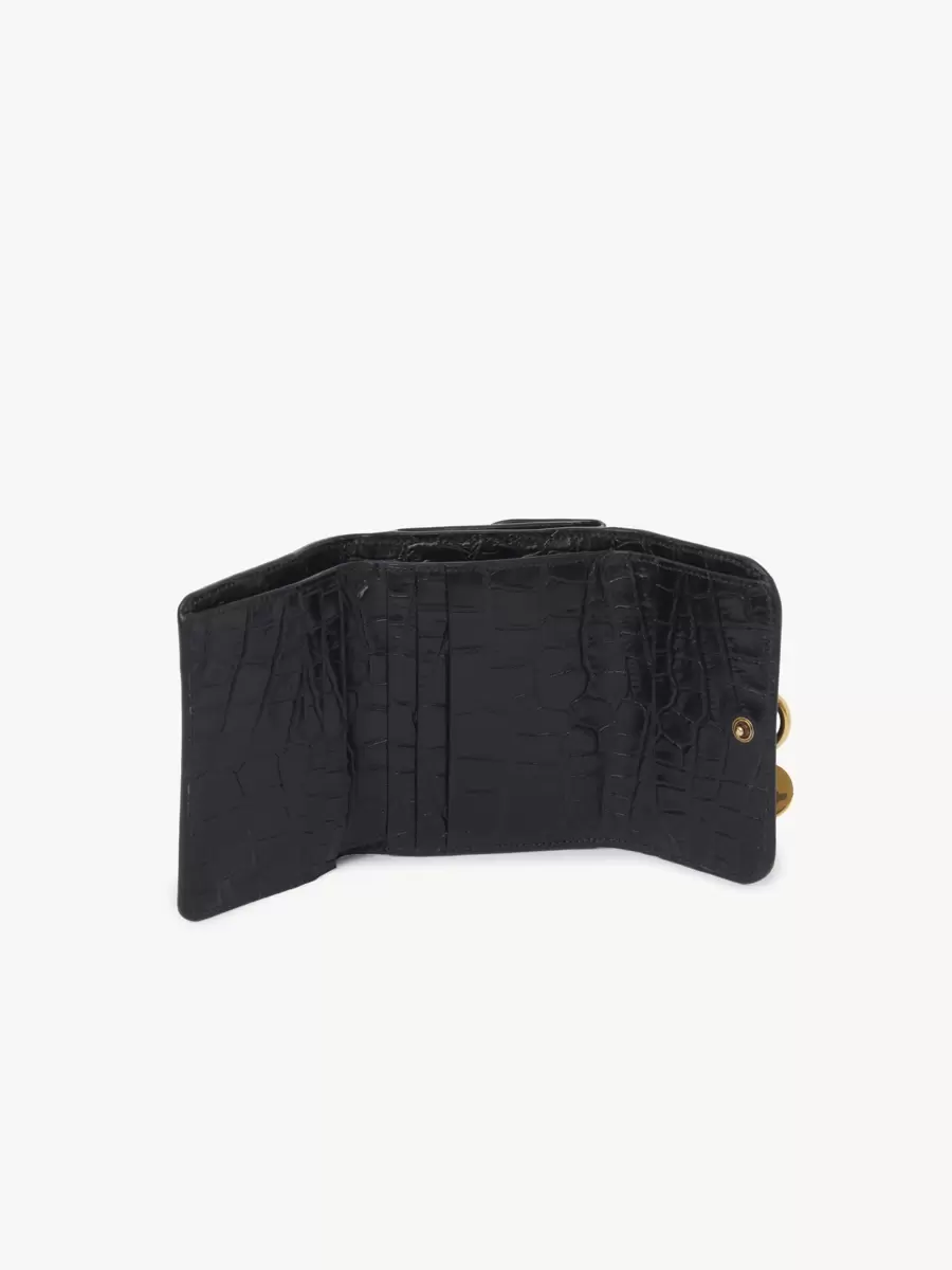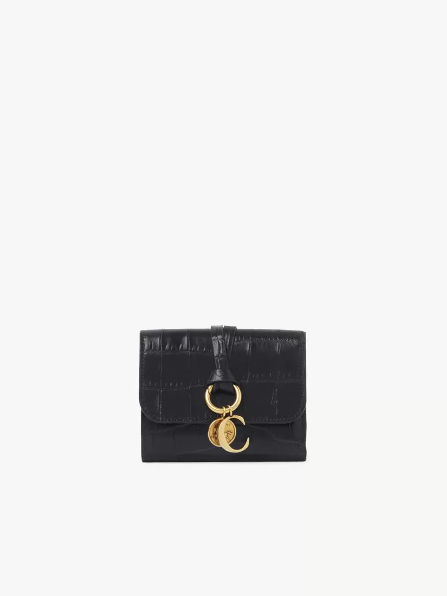 Maisons ikoniska Alphabet-kollektion inkluderar denna lilla trefaldiga plånbok i kalvskinn med krokodileffekt. Den är designad för att rymma det viktigaste och har flera kortfack och en platt ficka. Framsidan är avslutad med en knuten länk och Chloés signaturberlocker i guld med initialer och hästmedalj.