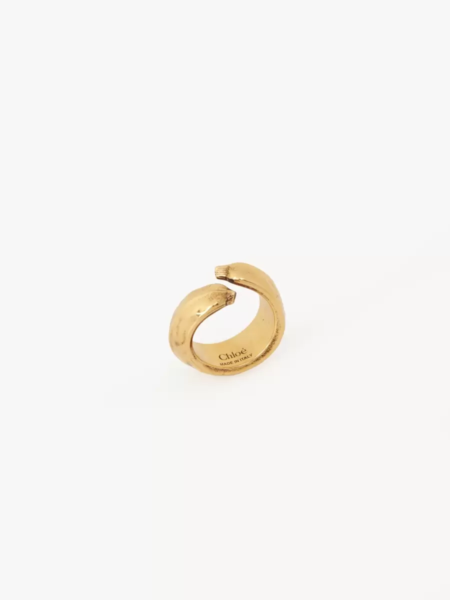 Chloé Bananas-ring i vintage guldmässing som syns på höst-vinter 2024 års catwalk, inspirerad av Maisons vårkollektion 2001. Ringen har en omslutande bananform, avslutad med Chloé-logotypen graverad.