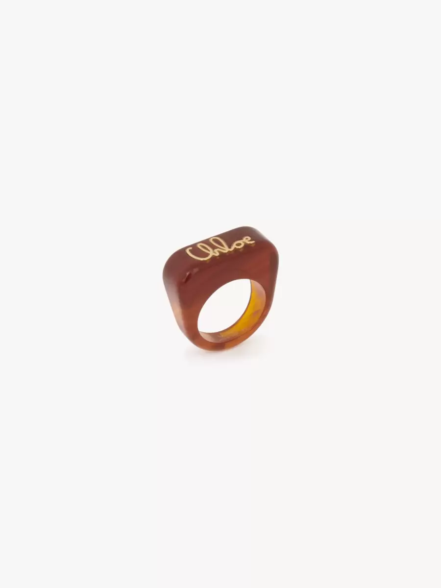 Chloé Plage-ring i brunt harts som visar upp Chloés ikoniska signatur i guldmässing.