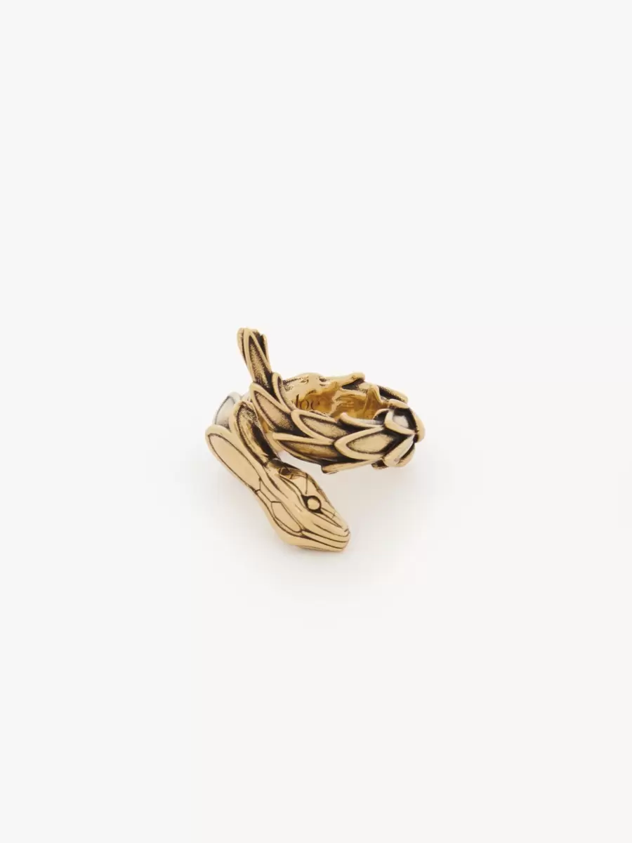 Chloé-ormring som presenteras på catwalken, inspirerad av broderi på en arkivbevarad Chloé-klänning. Stora skalor som skapar sofistikerad textur, en omslutande form och ett raffinerat ormhuvud gör denna ring till ett skulpturalt smycke. En blandning av guld- och svarta toner skapar textur.