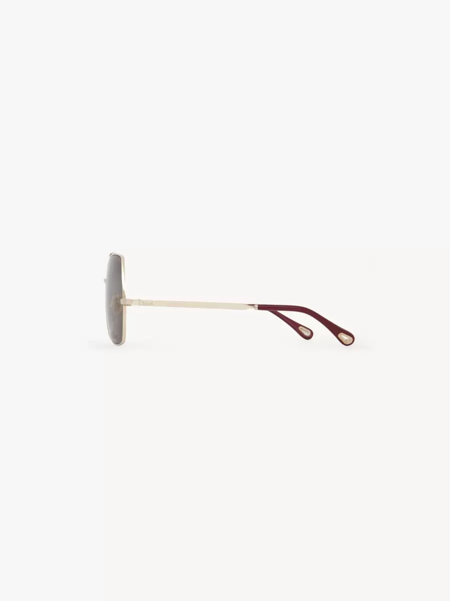 Dessa Aly-solglasögon erbjuder en modern uppdatering av den klassiska pilotformen. Fyrkantiga bågar i glänsande guldfärgad metall har trippelgradientade linser i en palett av brunt, grått och khaki. Chloé-logotypen fulländar den vänstra linsen.