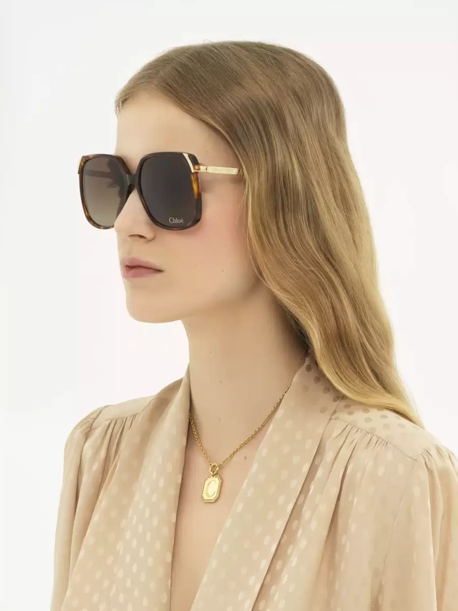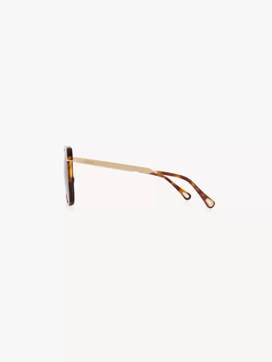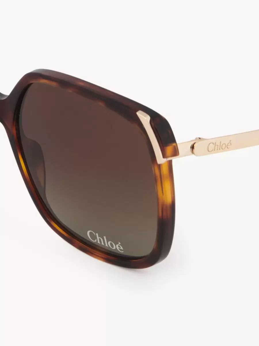 Dessa fyrkantiga solglasögon från Aly har bågar i 70-talsstil i en blandning av Havanna-acetat med låg slagfasthet och glänsande guldmetall. De dubbelgradientade bruna linserna är signerade med Chloé-logotypen.