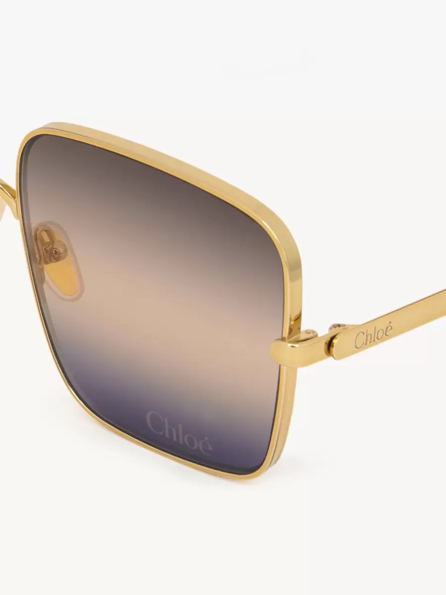 Dessa fyrkantiga solglasögon i Aly-stil har tjocka grafiska bågar i glänsande guldfärgad metall med tonade beige till blå linser. Chloé-logotypen fulländar den vänstra linsen.