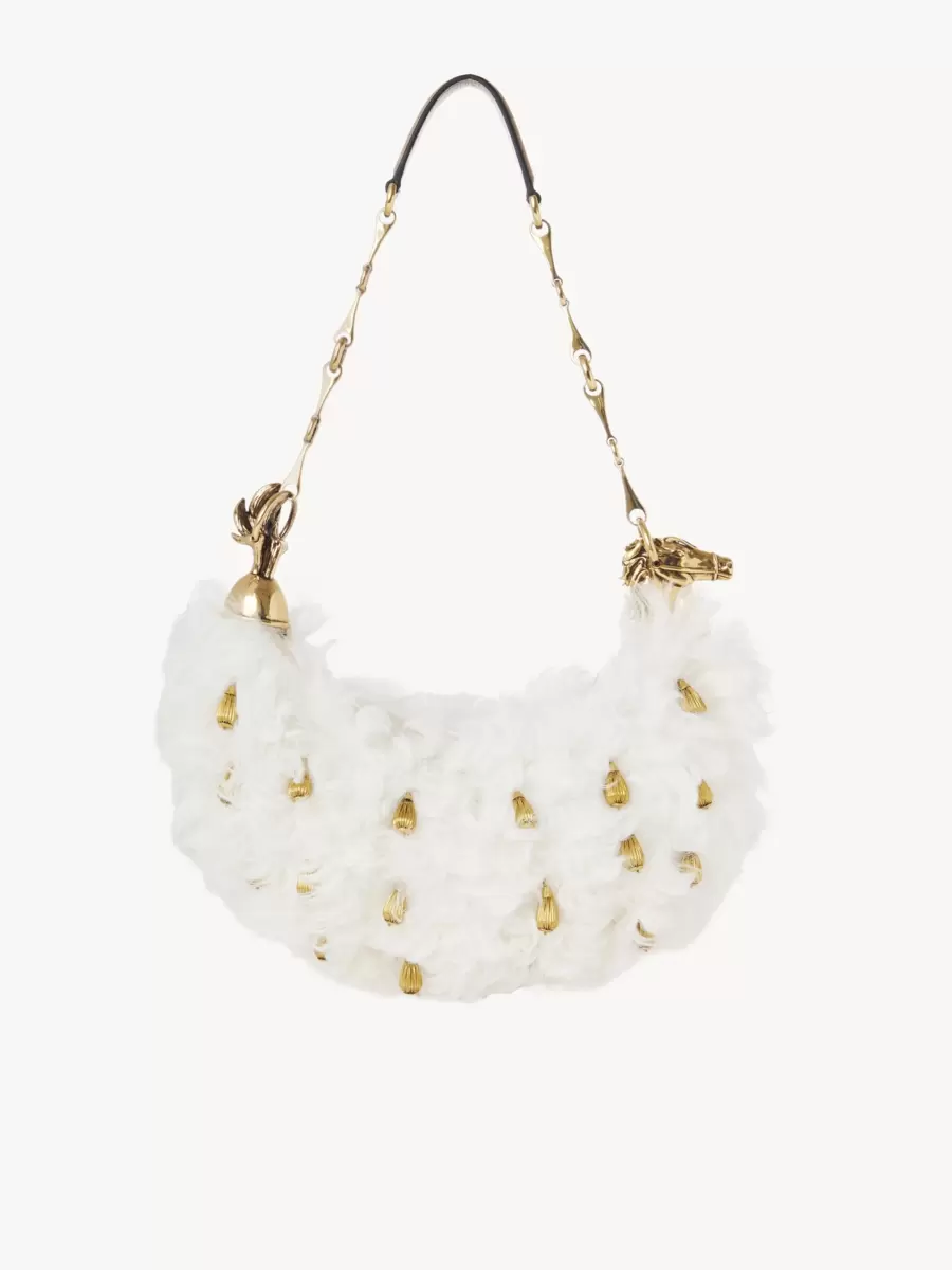 Denna Chain Horse-axelväska är tillverkad av fårskinn i en minimalistisk silhuett som framhävs av intrikata handbroderade guldfärgade pärlor. Inspirerad av ridvärlden är den färdigställd med seriens guldfärgade häst och en hästbettkedja.