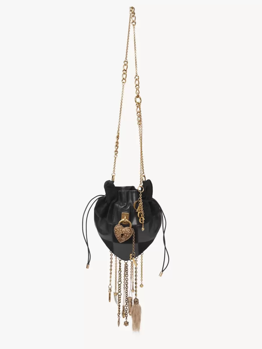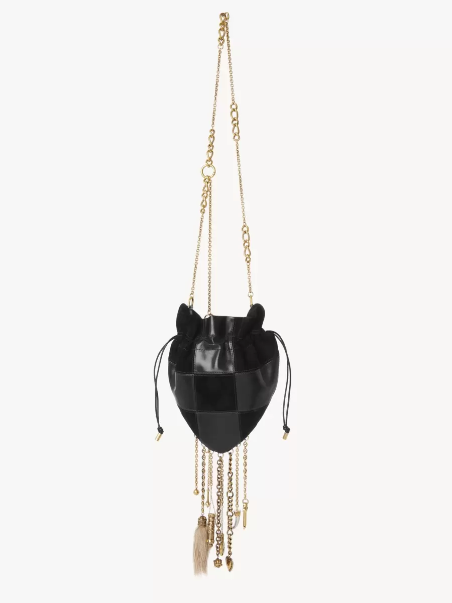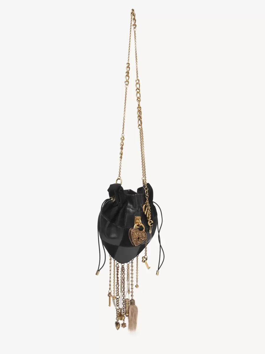 Château Treasures axelväska är tillverkad av ett lapptäcke av getskinn i mocka och narvat buffelläder och har en hjärtformad silhuett som accentueras av en dragsko. Ett överdimensionerat dekorativt hänglås med hjärtmönster detaljerar framsidan medan flera berlocker i olika storlekar och texturer dinglar från kedjor vid väskans bas.