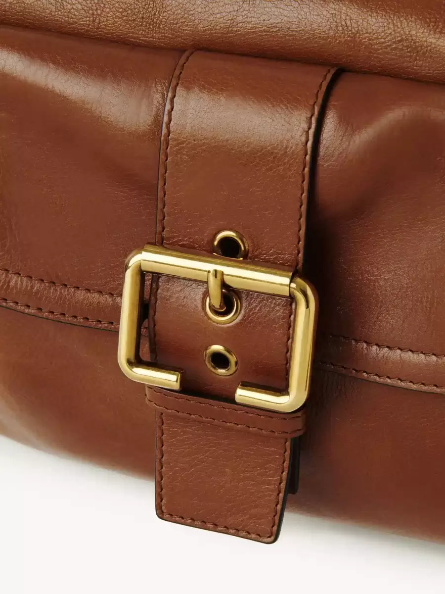 Denna kameraväska är tillverkad av naturligt glansigt buffelläder. Dess flera fickor är utsmyckade med omarbetade spännen från den ikoniska Paddington-väskan.