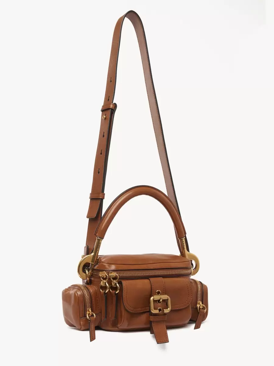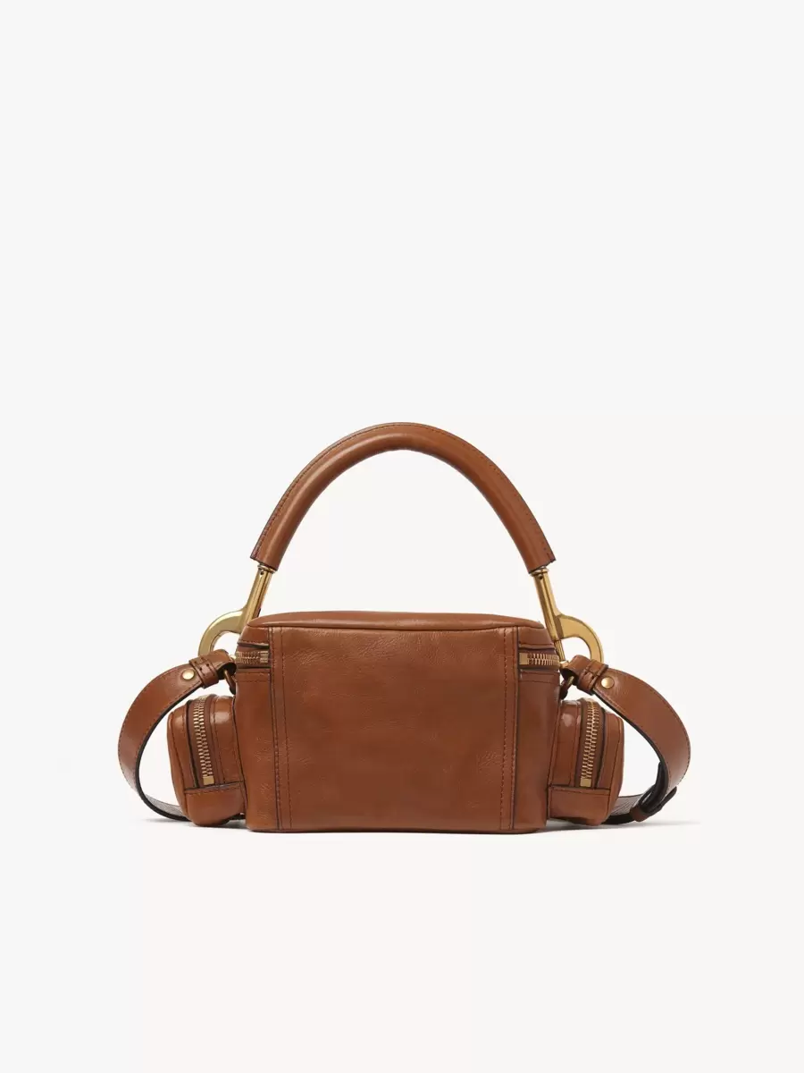 Denna lilla kameraväska är tillverkad av naturligt glansigt buffelläder. Dess flera fickor är utsmyckade med omgjorda dragkedjor och spännen från den ikoniska Paddington-väskan.