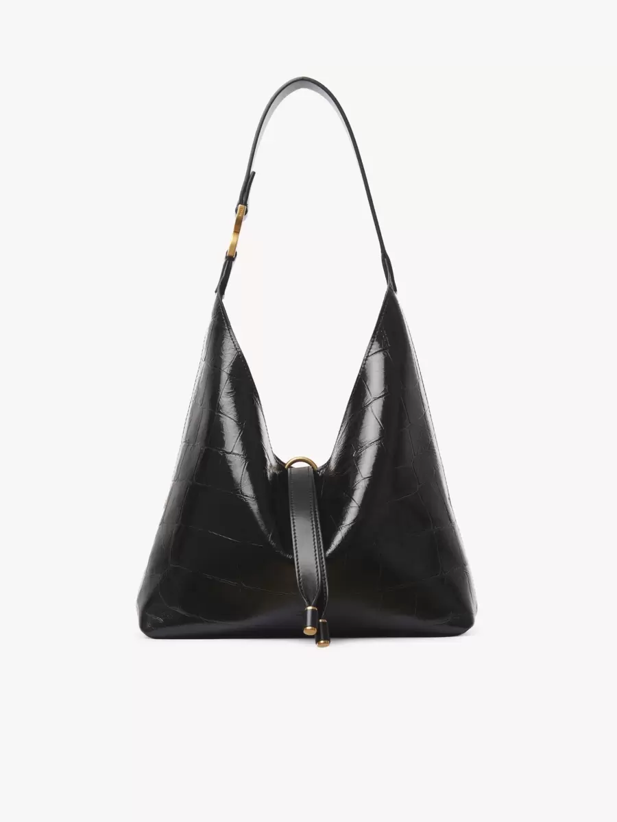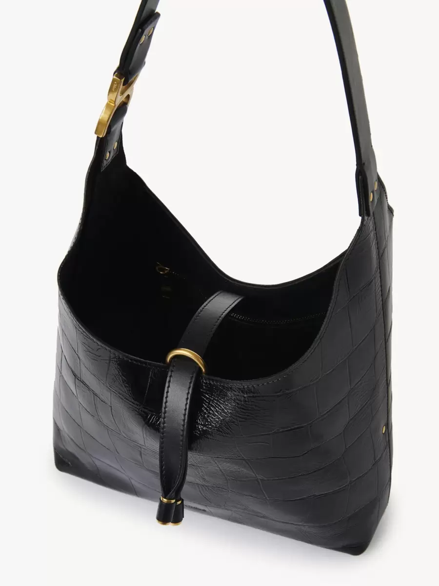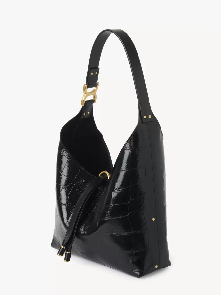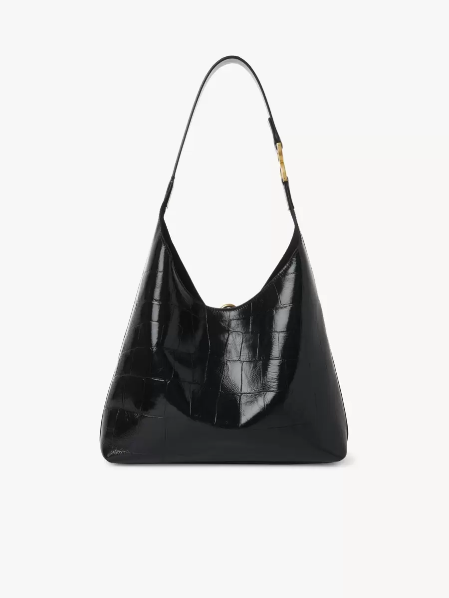 Denna lilla hoboväska från Marcie har en lös, minimalistisk silhuett. Tillverkad av glänsande kalvskinn med präglad krokodileffekt och ett nitat handtag utsmyckat med seriens ikoniska guldfärgade metallicdetalj. Signaturlädertofsar skyddar kalvskinnsinsidan.