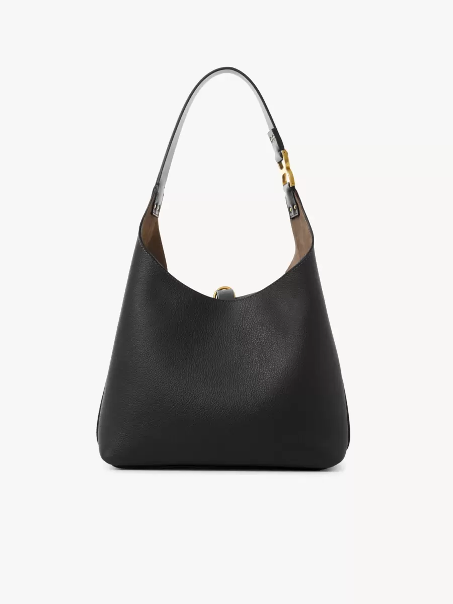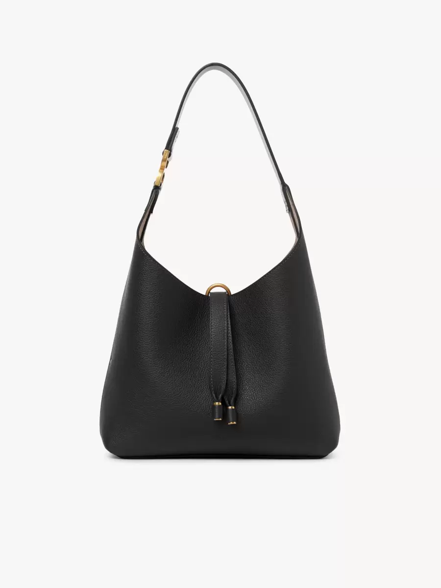 Denna lilla hoboväska från Marcie har en lös, minimalistisk silhuett. Tillverkad av narvat kalvskinn med ett kontrasterande nitat handtag utsmyckat med seriens ikoniska guldfärgade metallicdetalj. Signaturlädertofsar skyddar dess mockainredning.