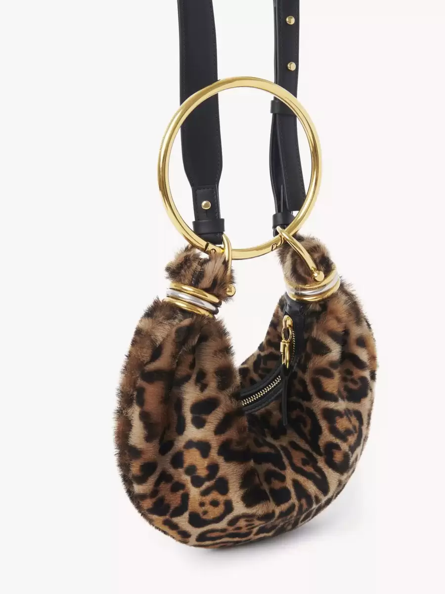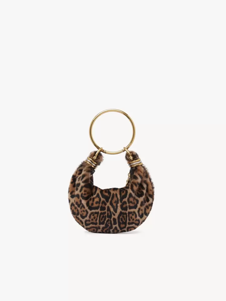 Inspirerad av Maisons arkiv är denna mini Bracelet Hobo-väska tillverkad av leopardmönstrat fårskinn. Den smidiga, rundade formen förstärks av ett armbandshandtag och staplade tvåfärgade ringar i ändarna.