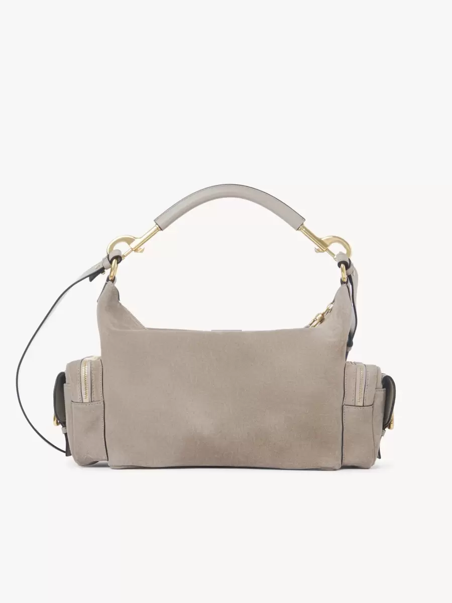 Denna kameraväska är tillverkad av mockakalvskinn. Dess flera fickor är utsmyckade med omarbetade spännen från den ikoniska Paddington-väskan.