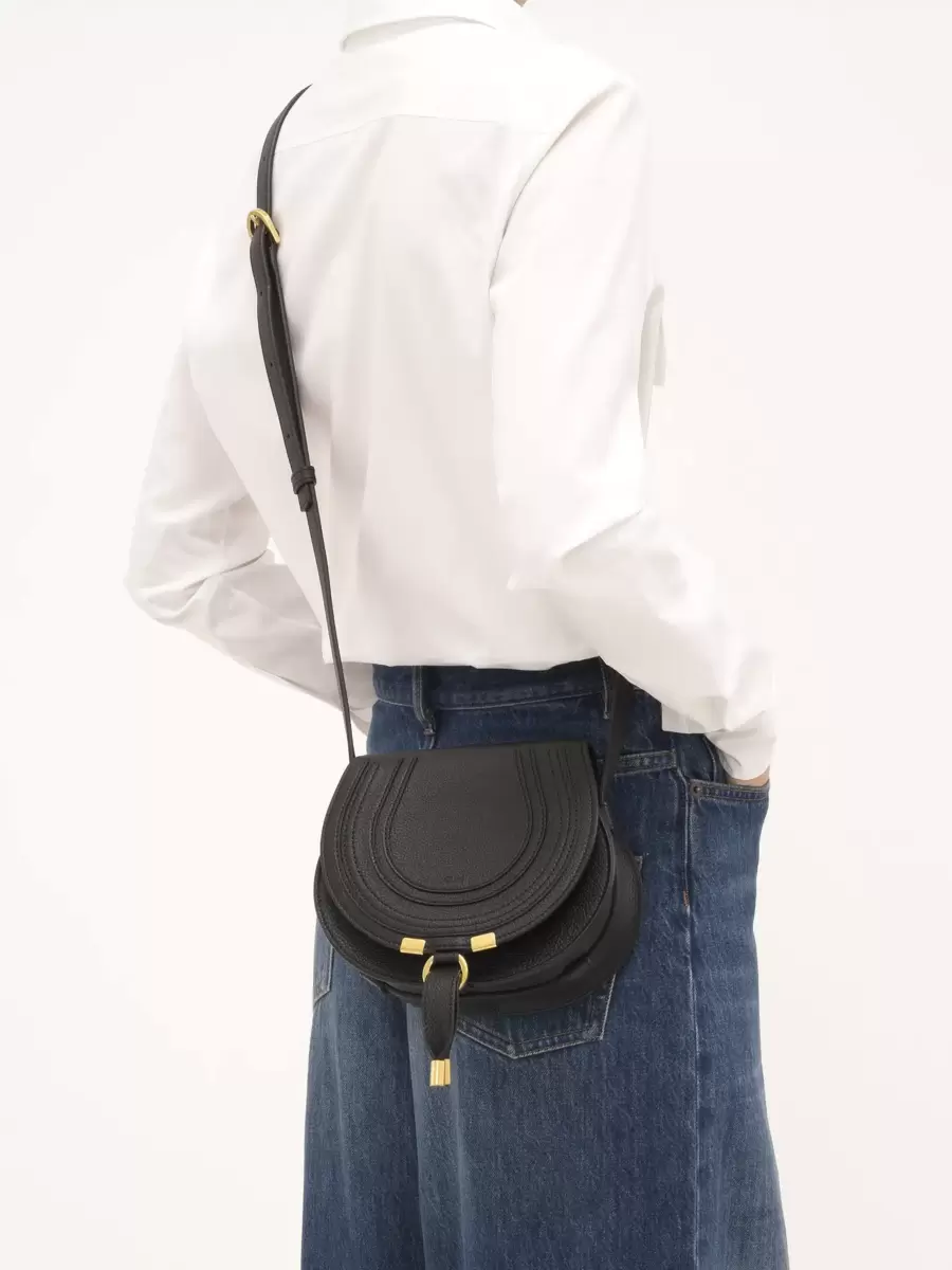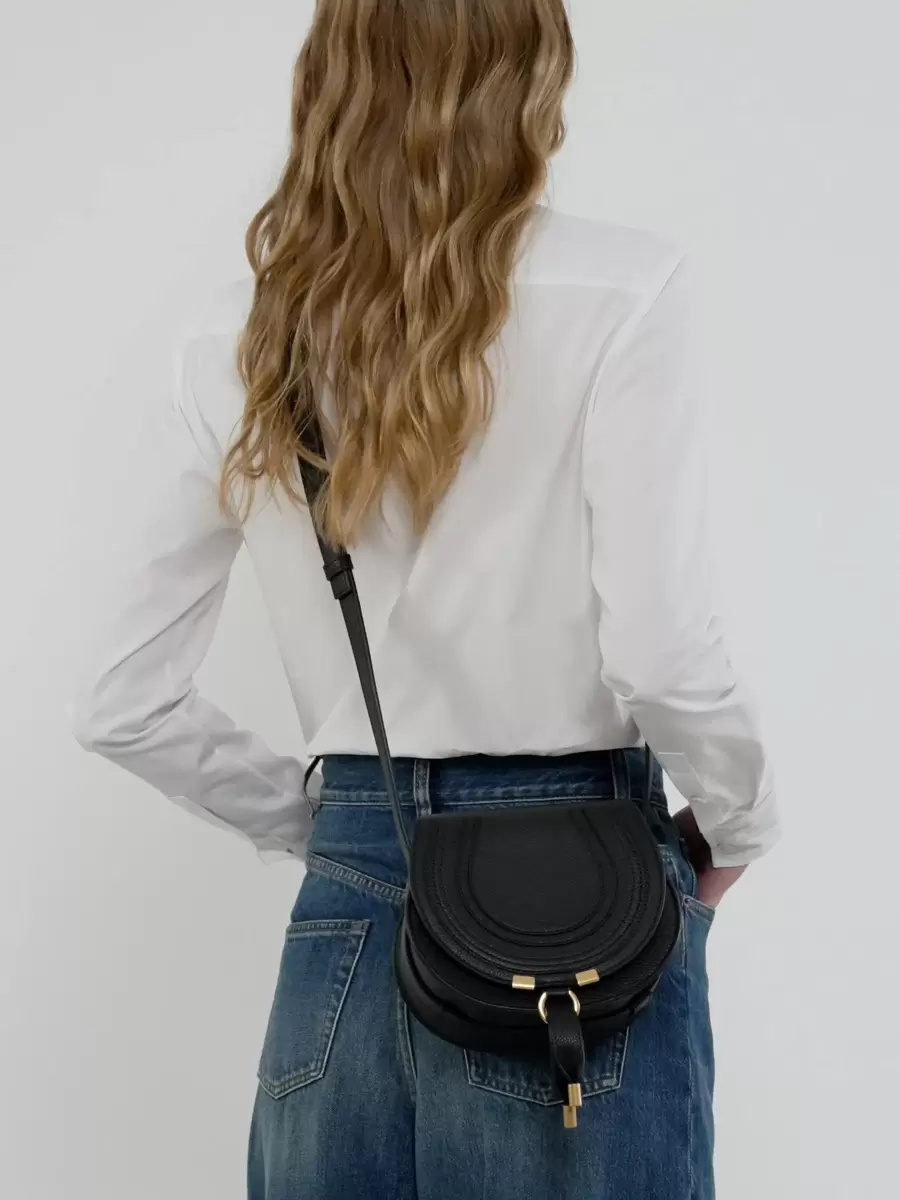 Denna lilla sadelväska från Marcie är tillverkad av narvat kalvskinn. Den harmoniska blandningen av en ren topplinje och rund silhuett är typisk för Maisons lek med maskulina och feminina toner. Marcies justerbara läderrem är perfekt för långa axlar och axelband.