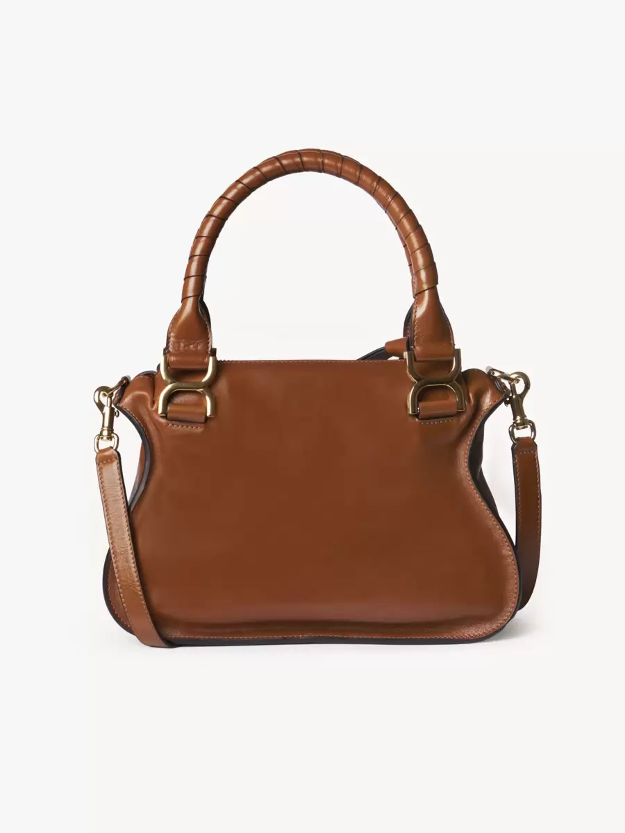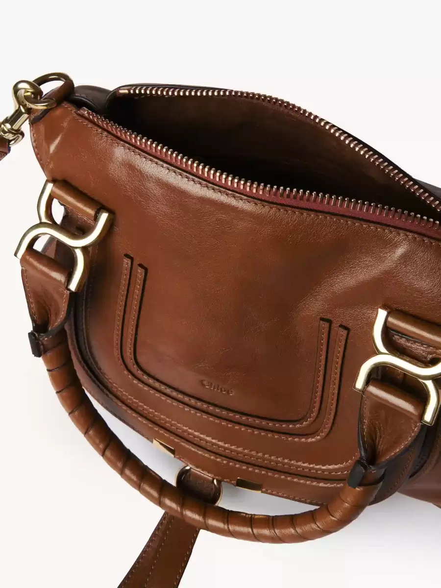 Denna lilla Marcie-väska är tillverkad av glänsande kalvskinn och har en lös silhuett med feminina linjer. Den är färdigställd med sadelsömnad, ikoniska guldfärgade spännen och handgjorda dubbla handtag. Linjens lädertofsar säkrar fliken.
