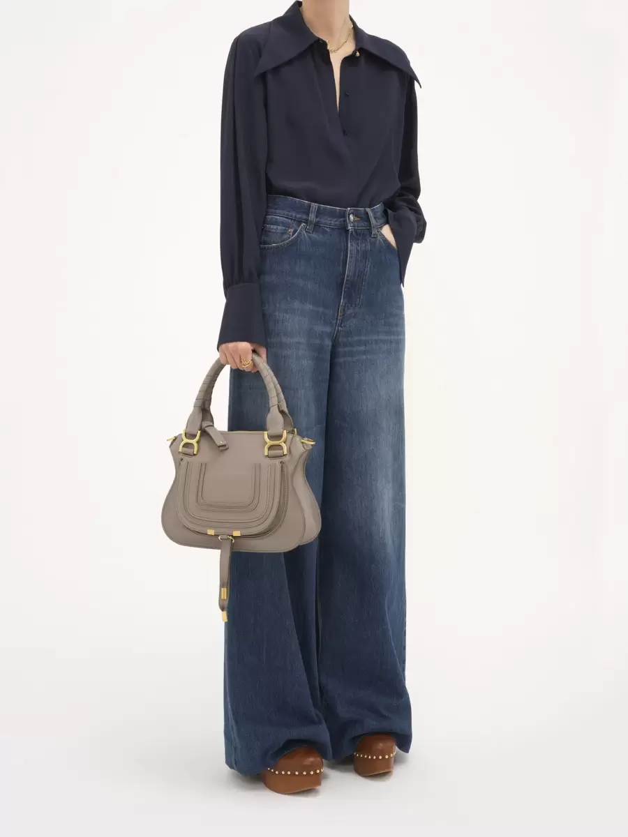 En mer kompakt version av den ikoniska Marcie-väskan, denna lilla väska är tillverkad av narvat kalvskinn. Rena linjer och en konturerad design förstärker den slappnade silhuetten, medan handgjorda läderhandtag ger hantverksmässiga detaljer. De X-formade spännena ger en raffinerad finish. Dubbla handtag och en lång, avtagbar axelrem gör denna lilla dubbla bärväska till ett verkligt mångsidigt accessoar.