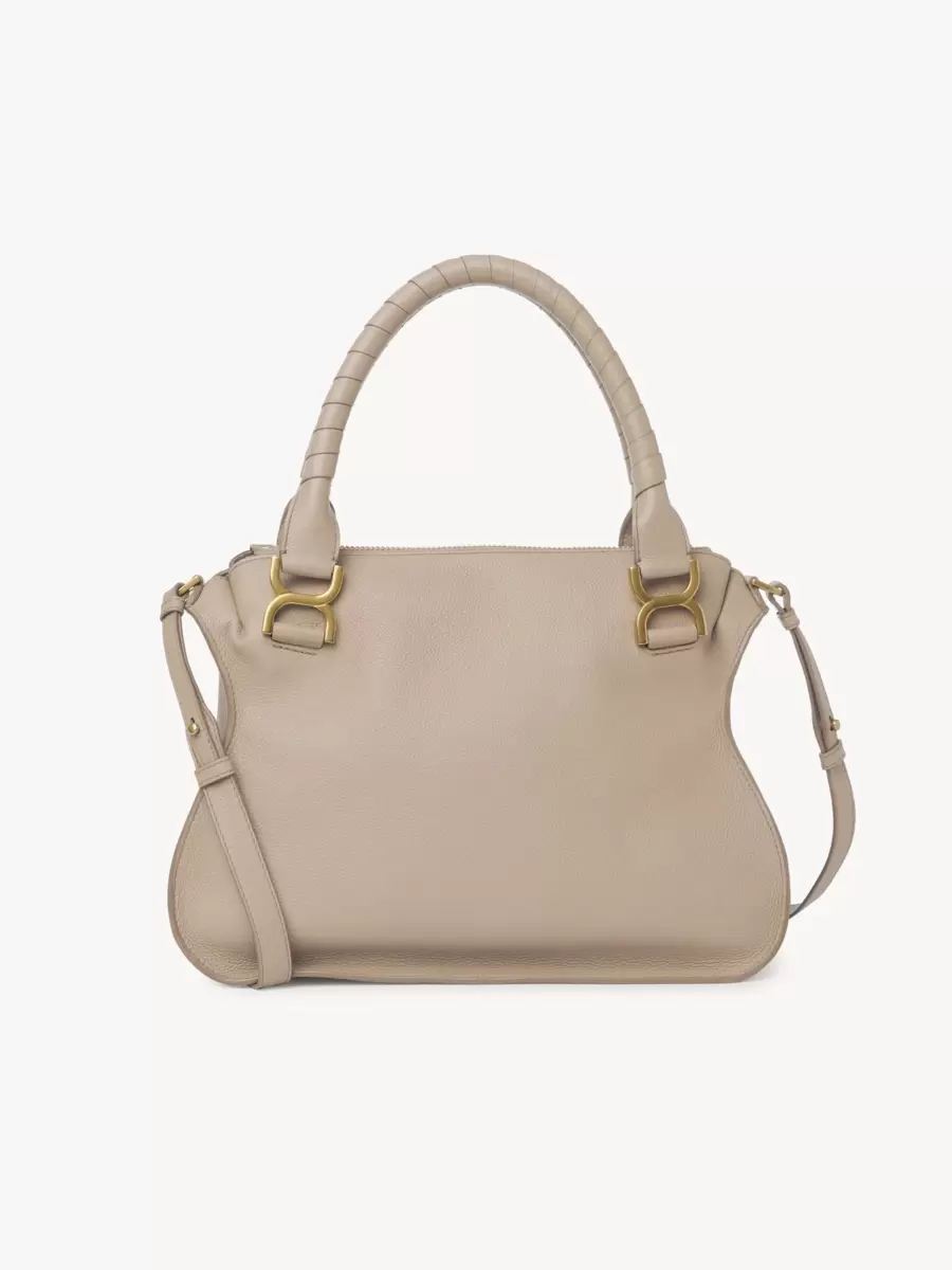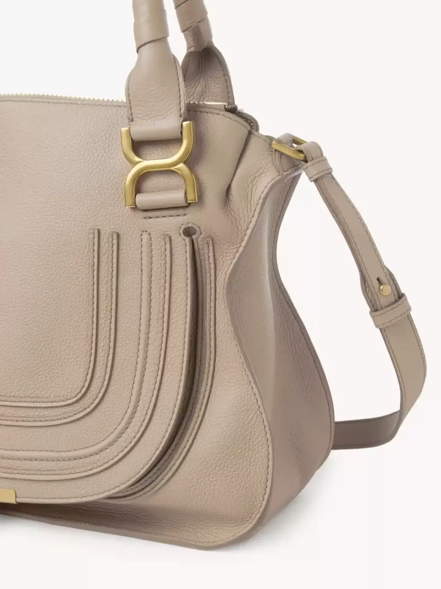 Denna lilla Marcie-handväska är tillverkad av narvat kalvskinn och har en lös silhuett med feminina linjer. Den är färdigställd med sadelsömnad, ikoniska guldfärgade spännen och handgjorda dubbla handtag. Linjens dinglande lädertofsar säkrar fliken.