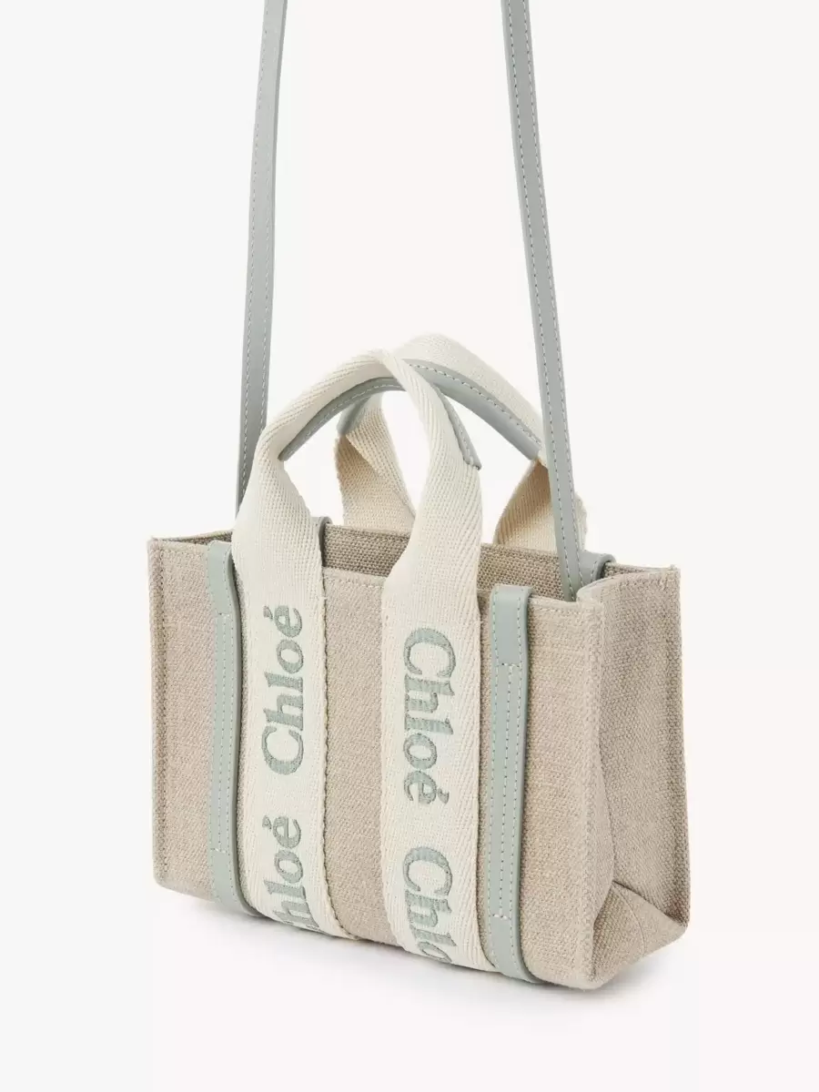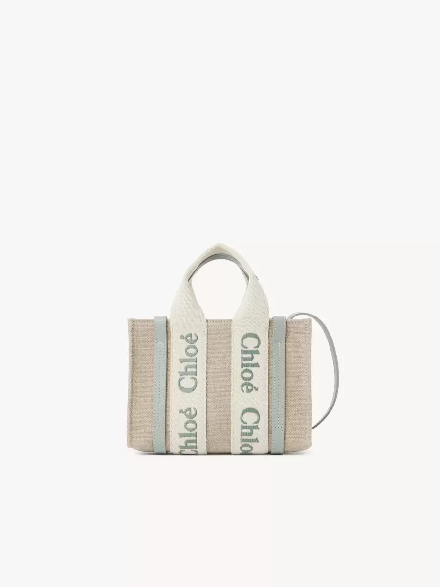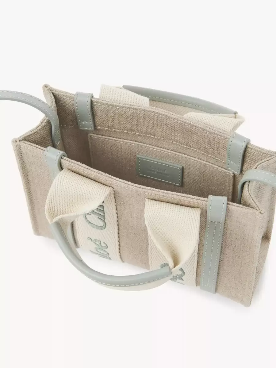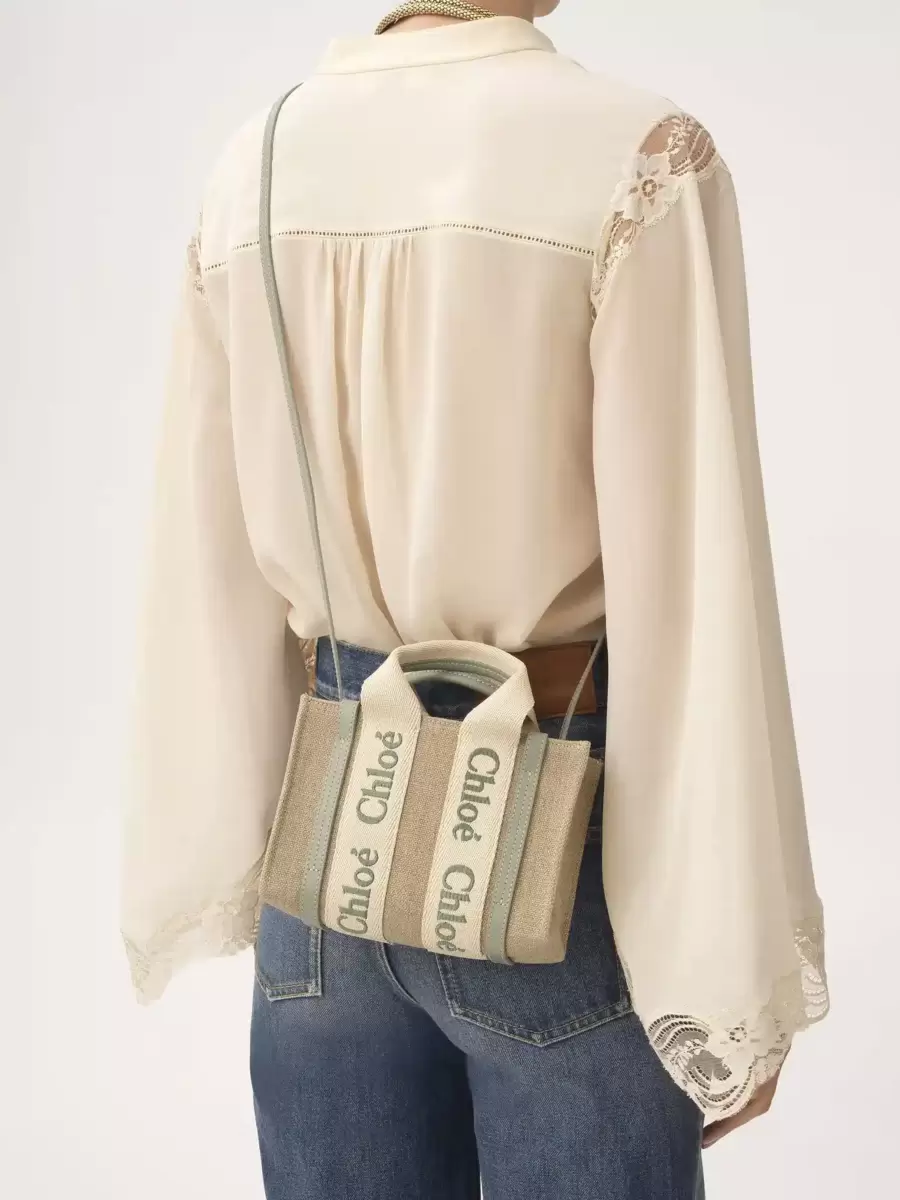 Denna mini-toteväska i stilen Woody är tillverkad av linnecanvas och glänsande kalvskinn och är en kompakt accessoar med en vardaglig attityd. Huvudfacket rymmer en mobiltelefon.