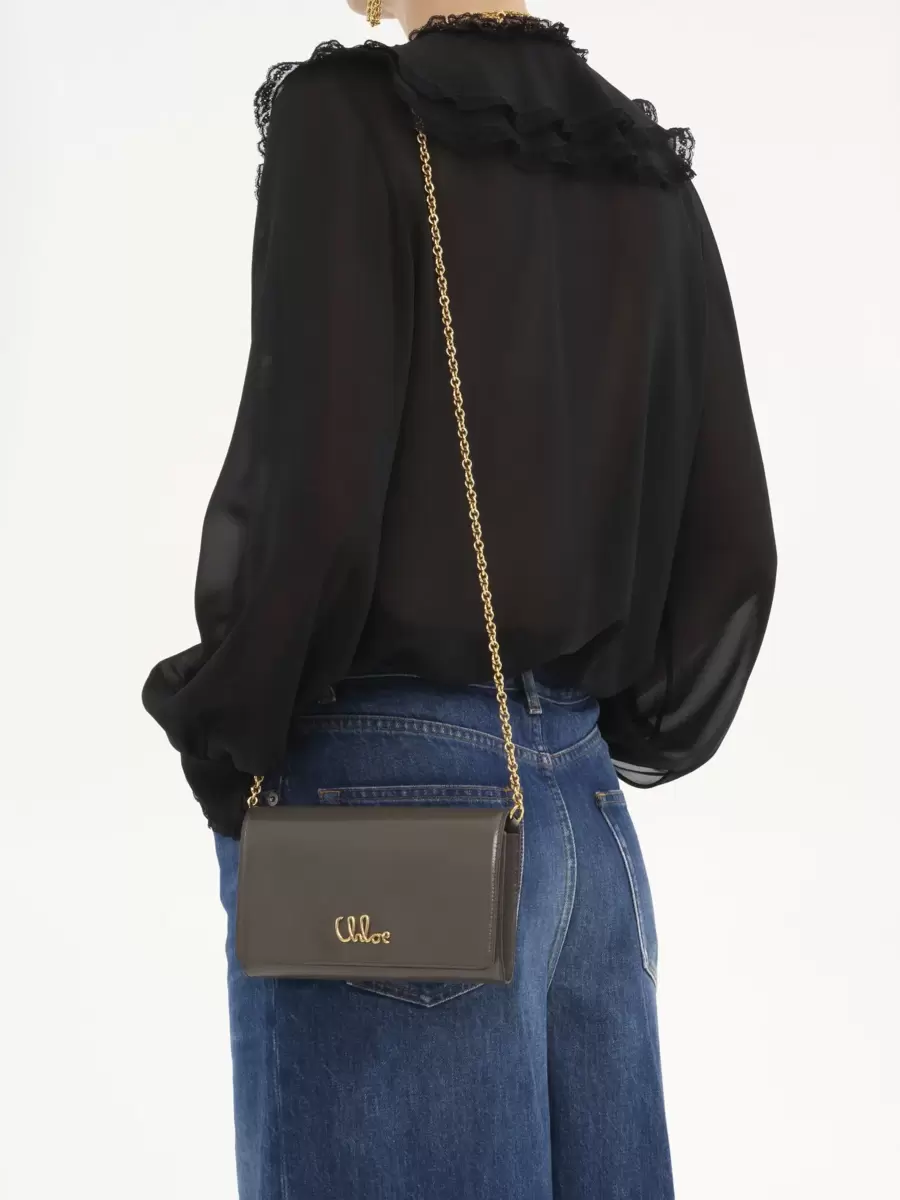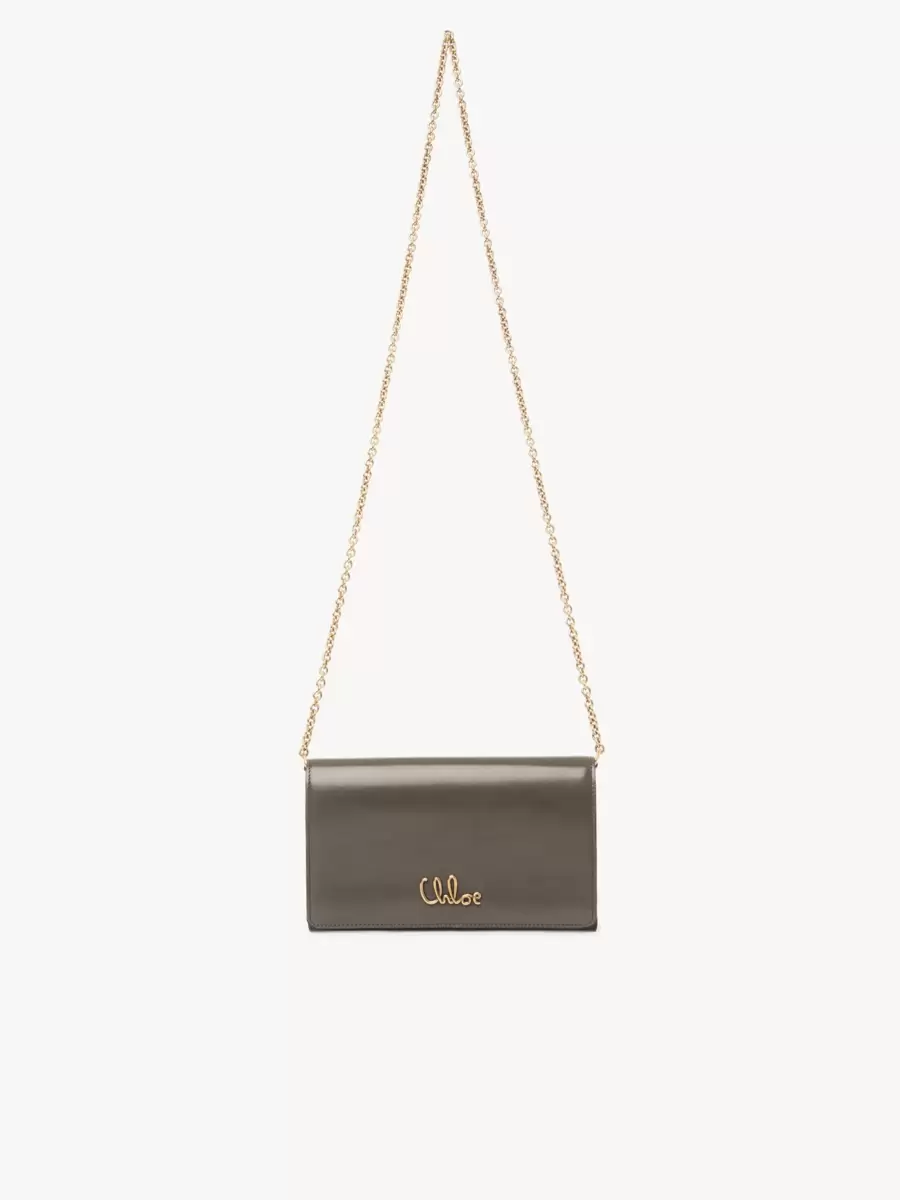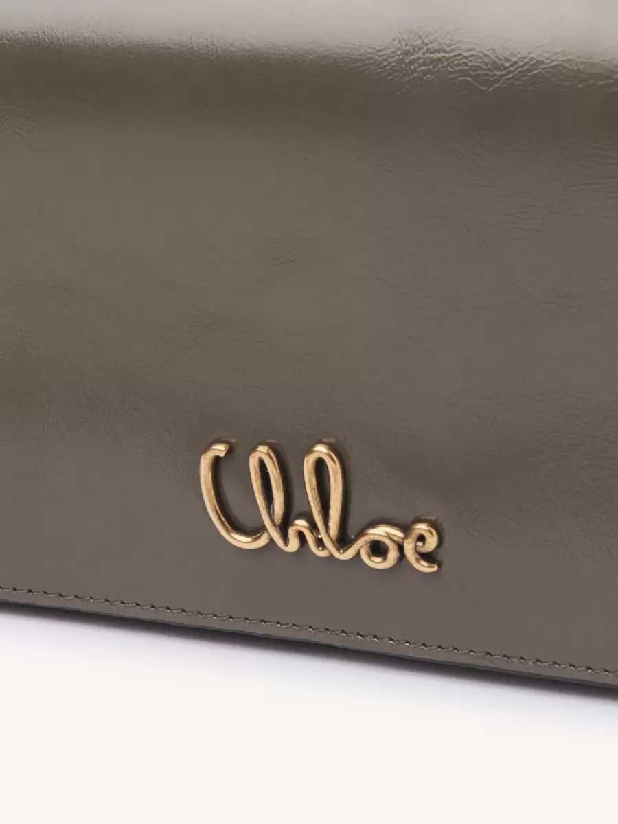 Chloé Iconic plånbok med lock och kedja är tillverkad av glansigt kalvskinn och kombinerar en minimalistisk silhuett med en metallisk signatur från Maisons arkiv.