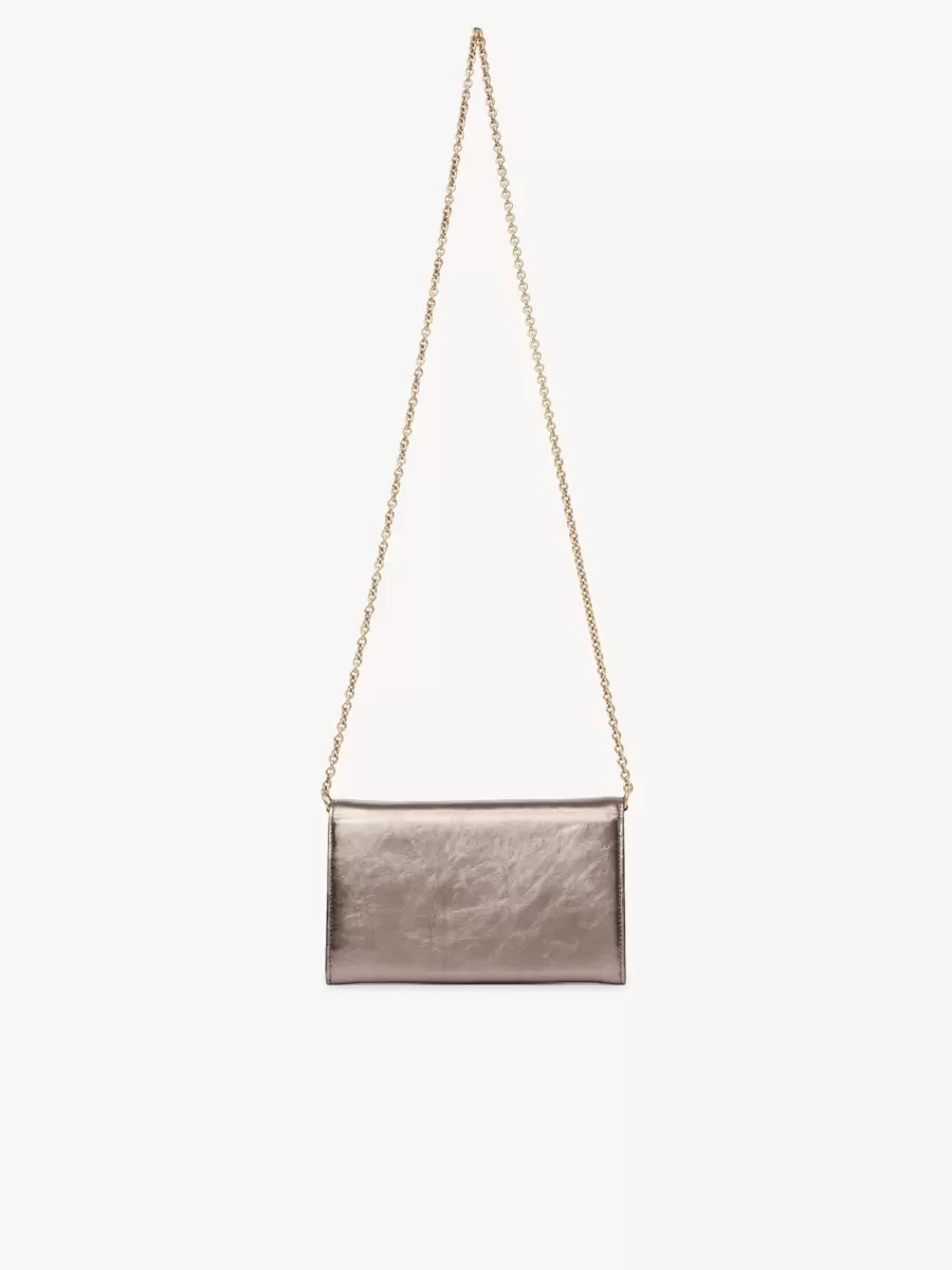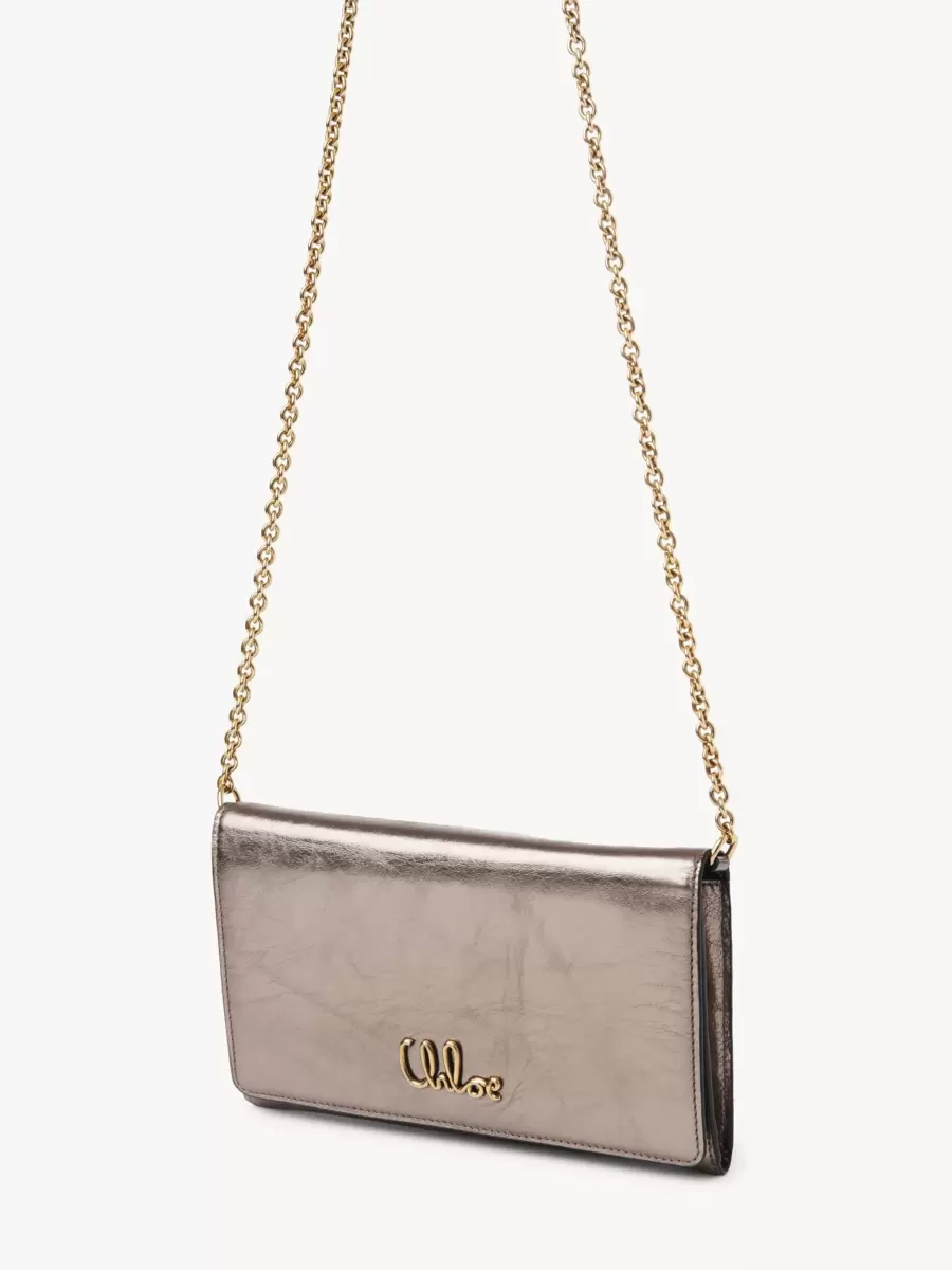 Chloé Iconic plånbok med lock och kedja är tillverkad av metalliserat kalvskinn och kombinerar en minimalistisk silhuett med en metallisk signatur från Maisons arkiv.