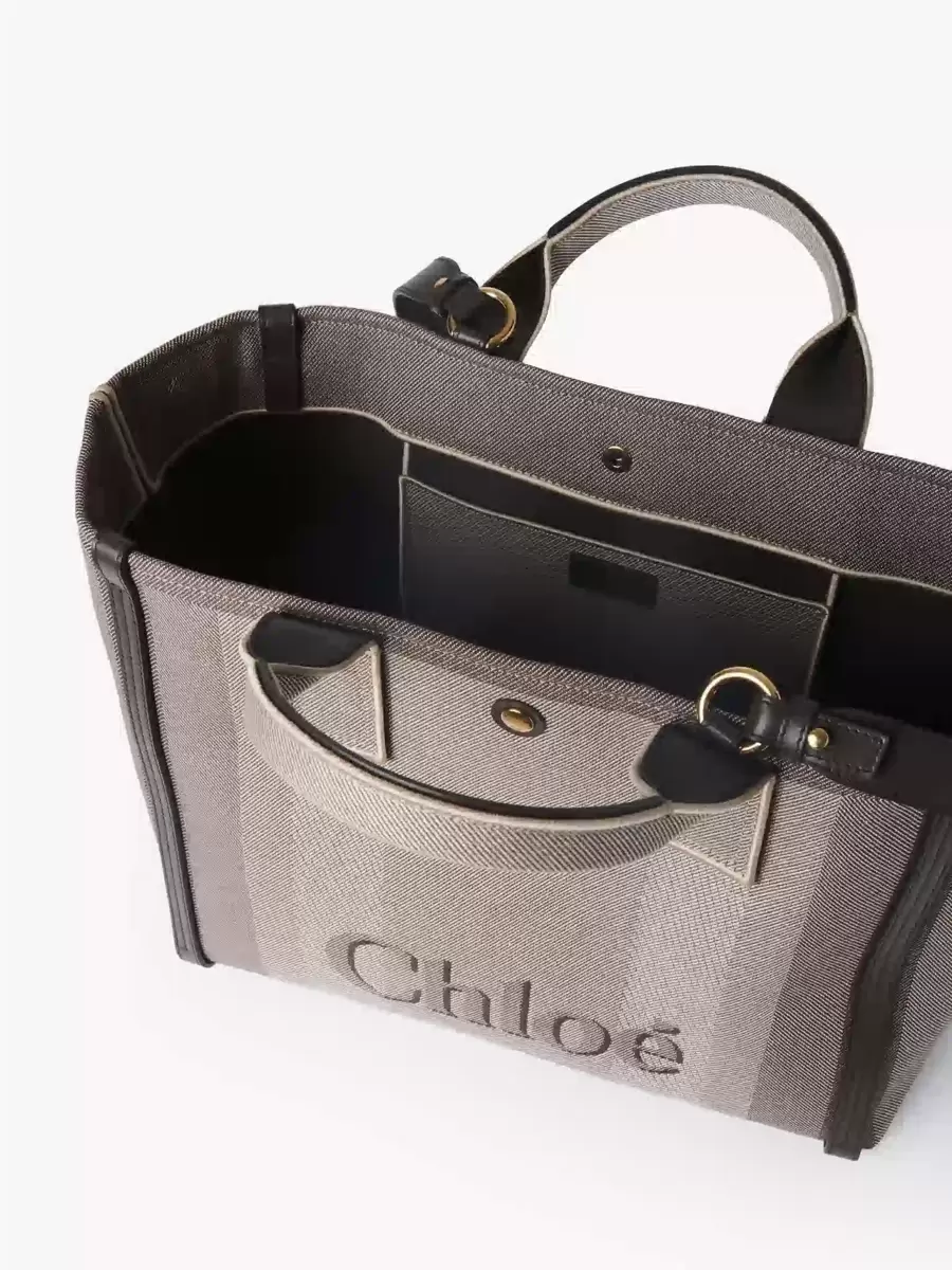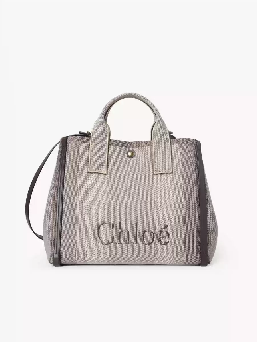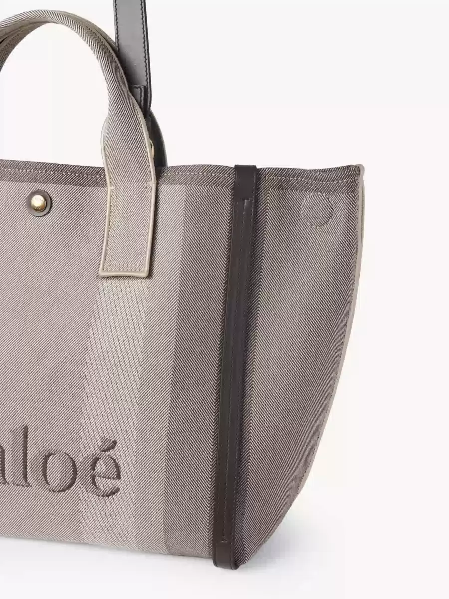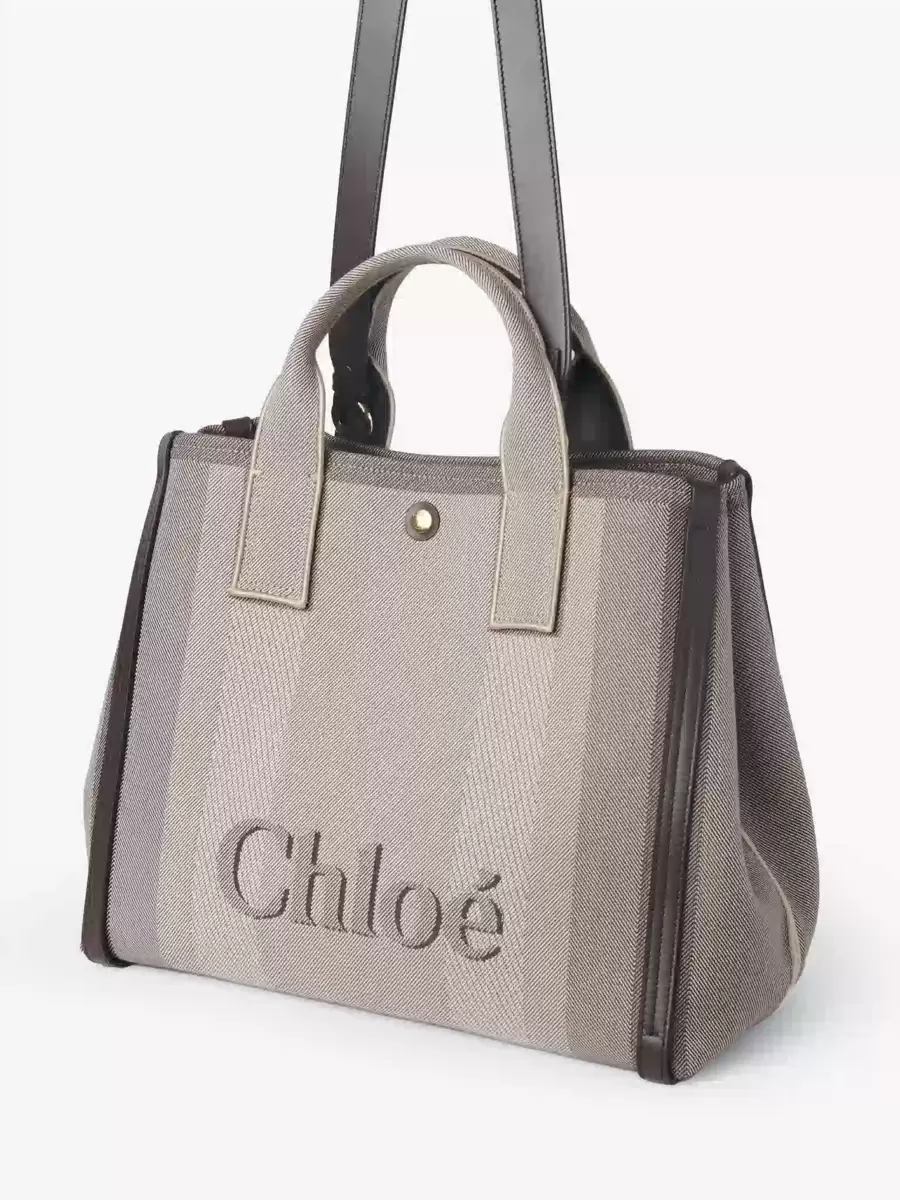 Chloé Carry-tygväskan är tillverkad av randig bomullscanvas-jacquard, kompletterad med kontrasterande vertikala läderband och en överdimensionerad Chloé-logotyp.