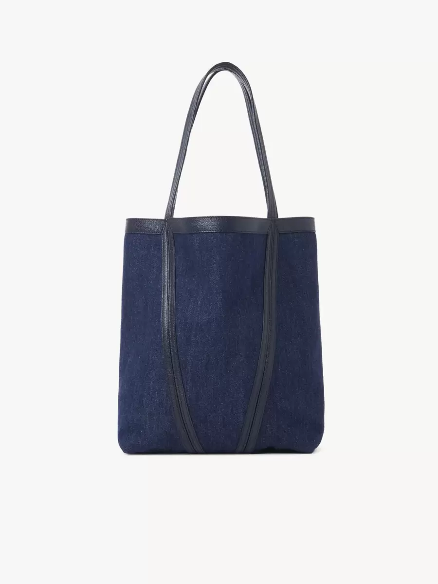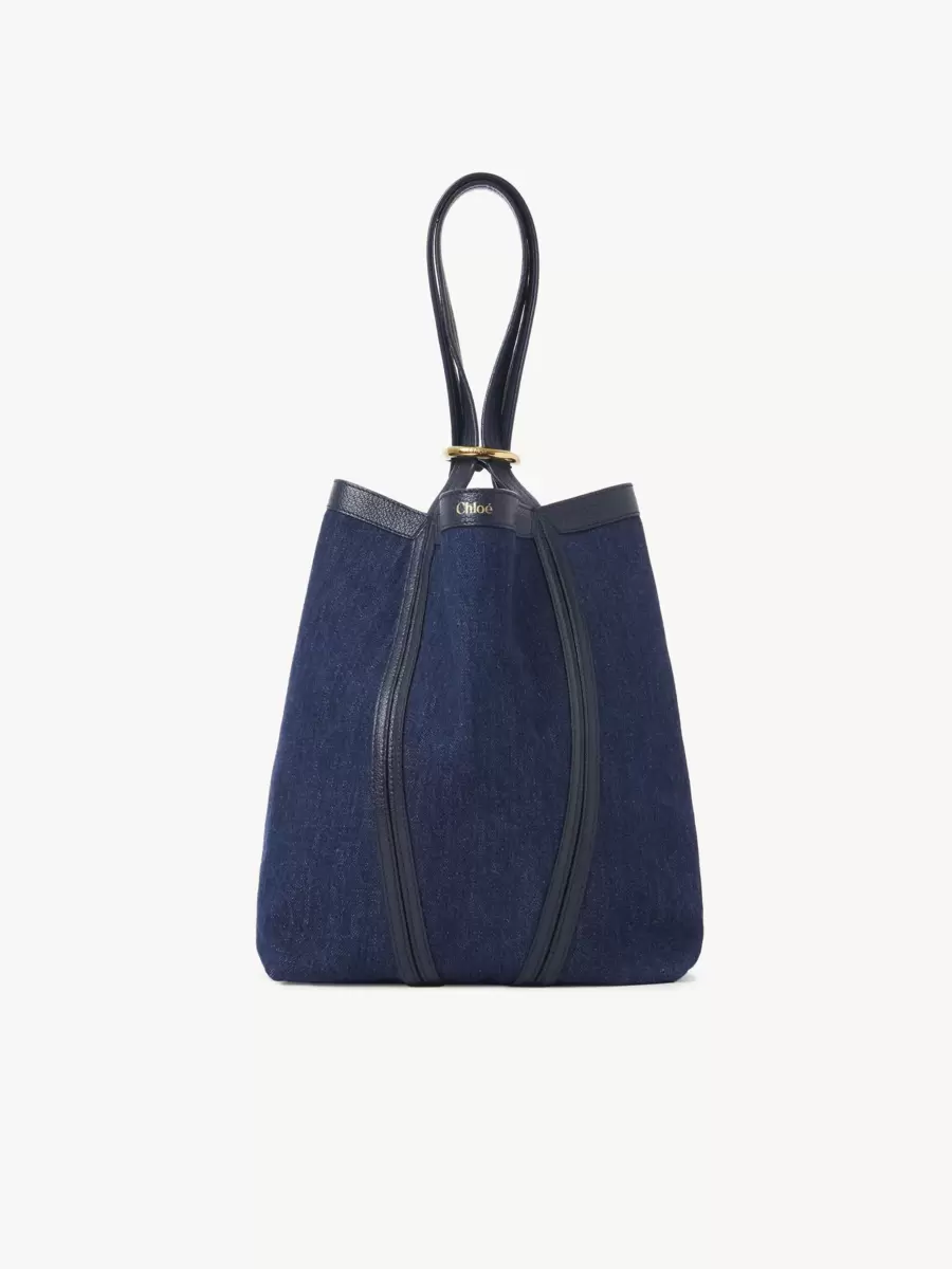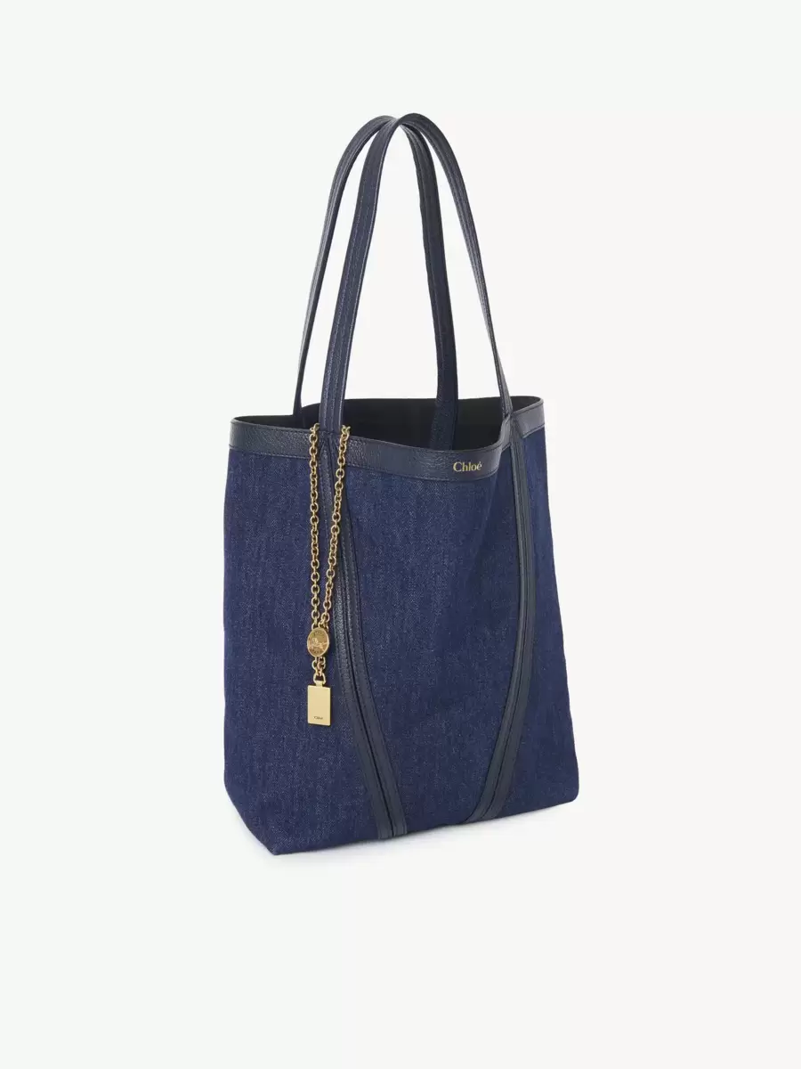 Tillverkad av denim och kohud har Chloé Spin-tygväskan en minimalistisk silhuett med grafiska linjer. En dinglande kedja pryder Maisons signaturmedaljer Chloé och hästmedaljer.
