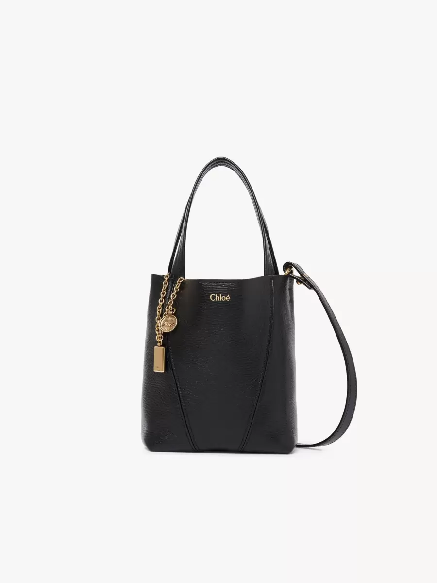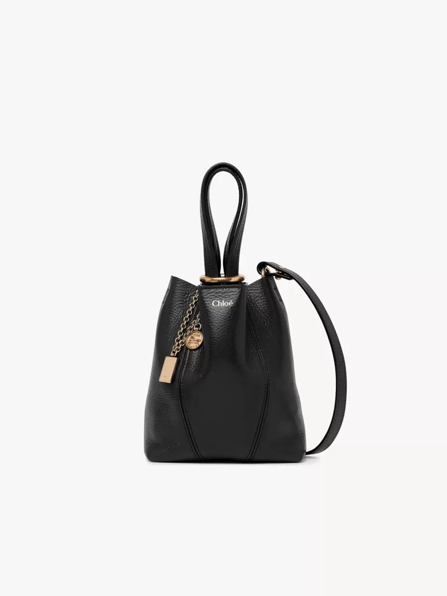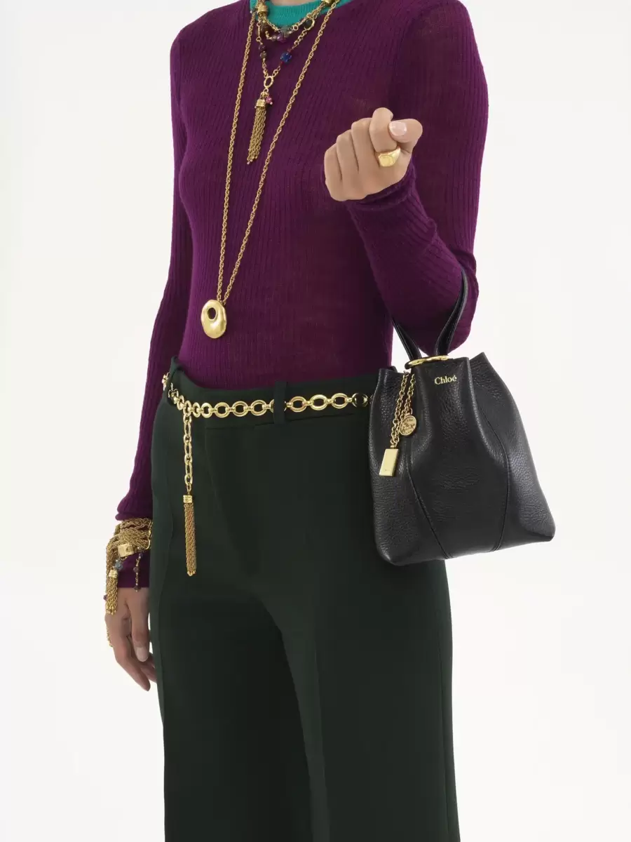 Tillverkad av glänsande, narvat nötskinn, har den lilla Chloé Spin-tygväskan en minimalistisk silhuett med grafiska linjer. En dinglande kedja pryder Maisons signatur Chloé- och hästmedaljer.