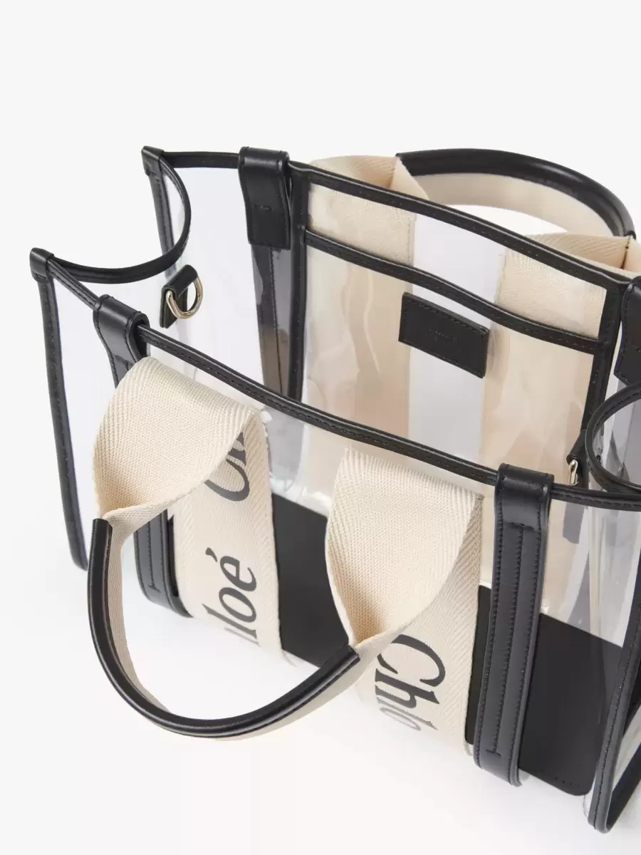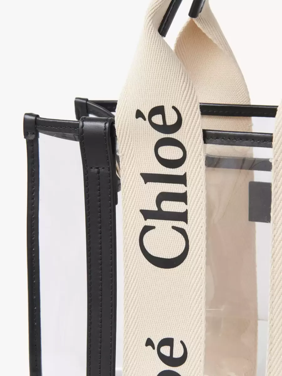 Denna lilla Woody-tygväska i gelé förhöjs av kontrasterande vertikala ränder i kalvskinn och signaturcanvasband med Chloé-logotypen.