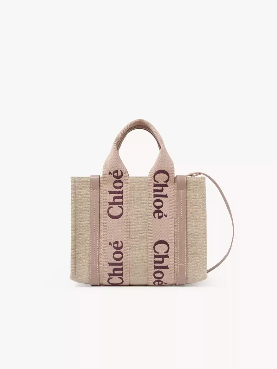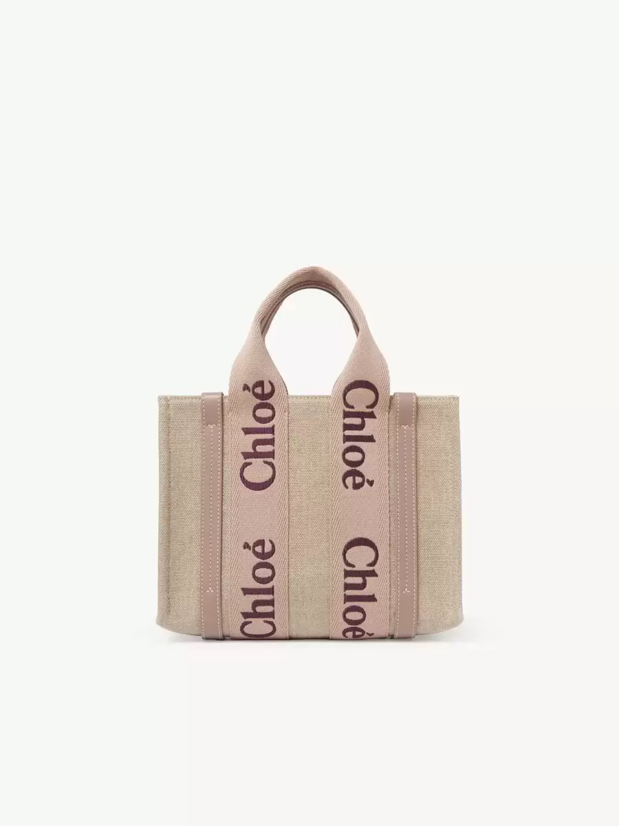 Liten Woody-tygväska i linnecanvas, kalvskinn och vävband med Chloé-logotypbroderi.