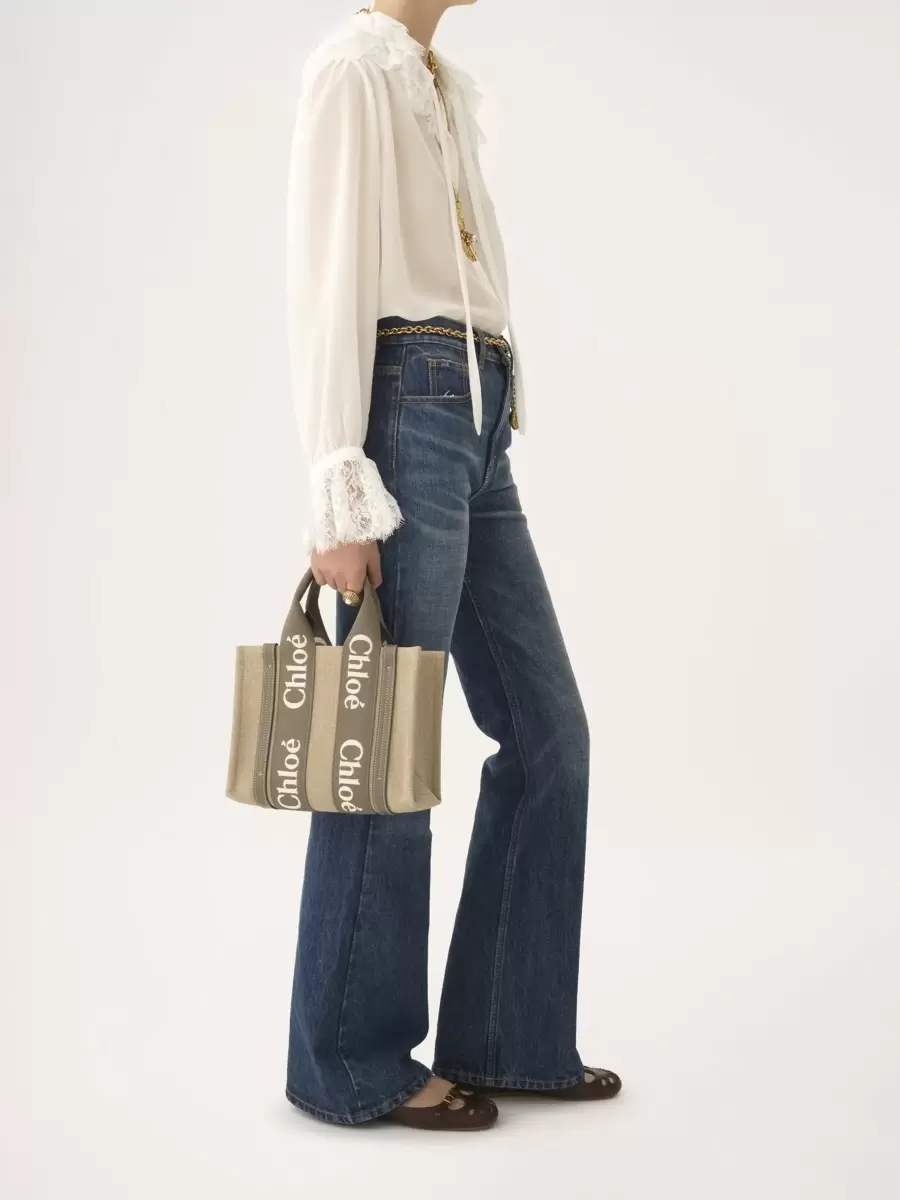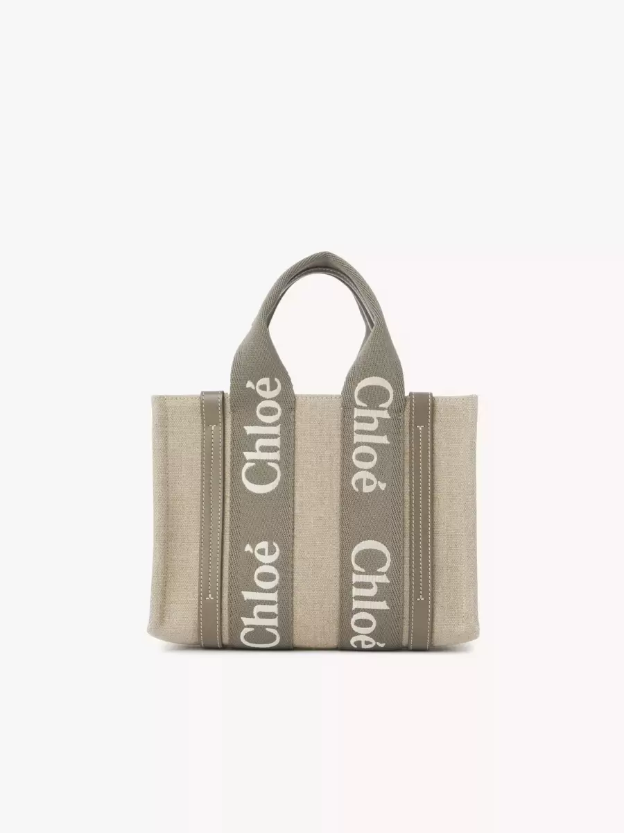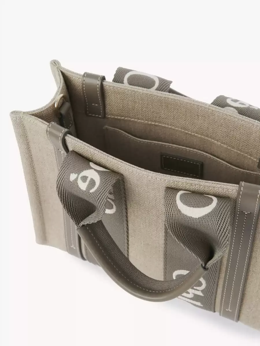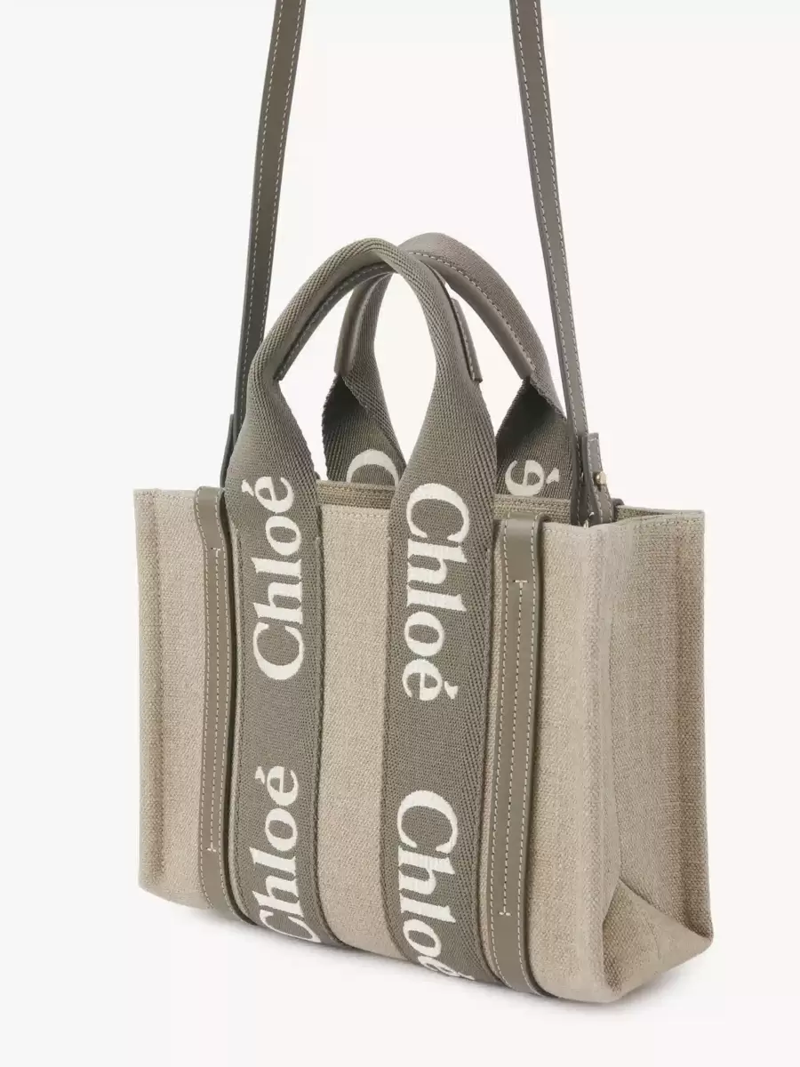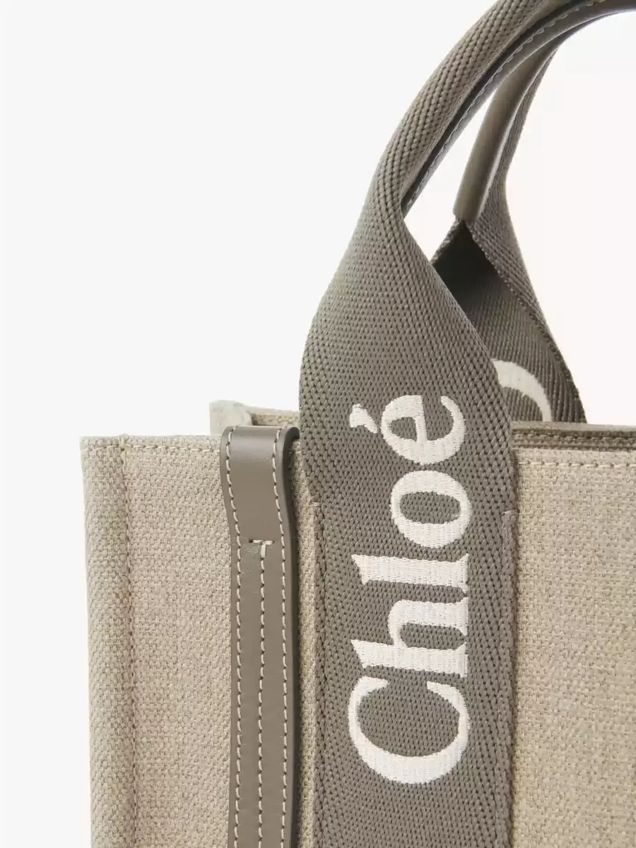 Liten Woody-tygväska i linnecanvas, kalvskinn och vävband med Chloé-logotypbroderi.