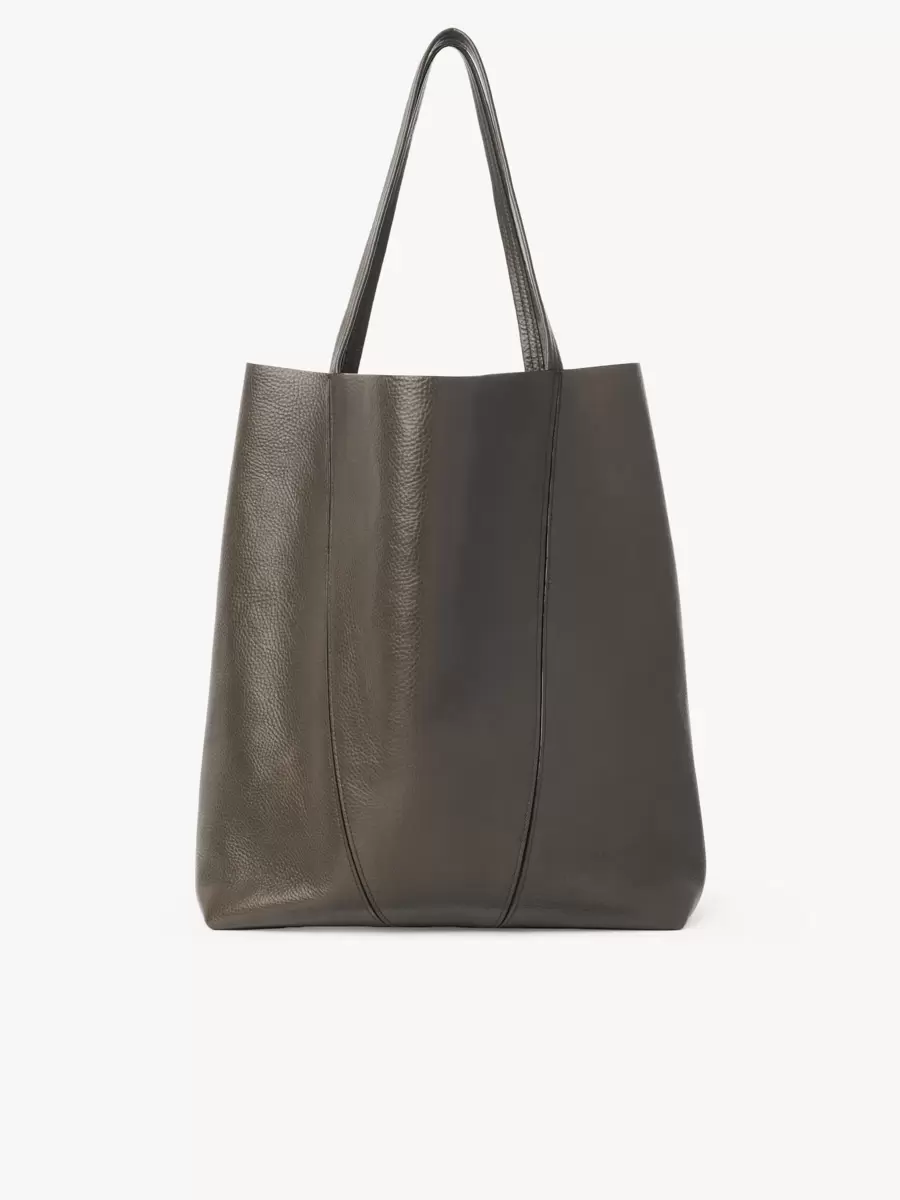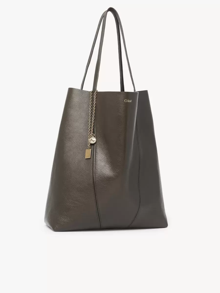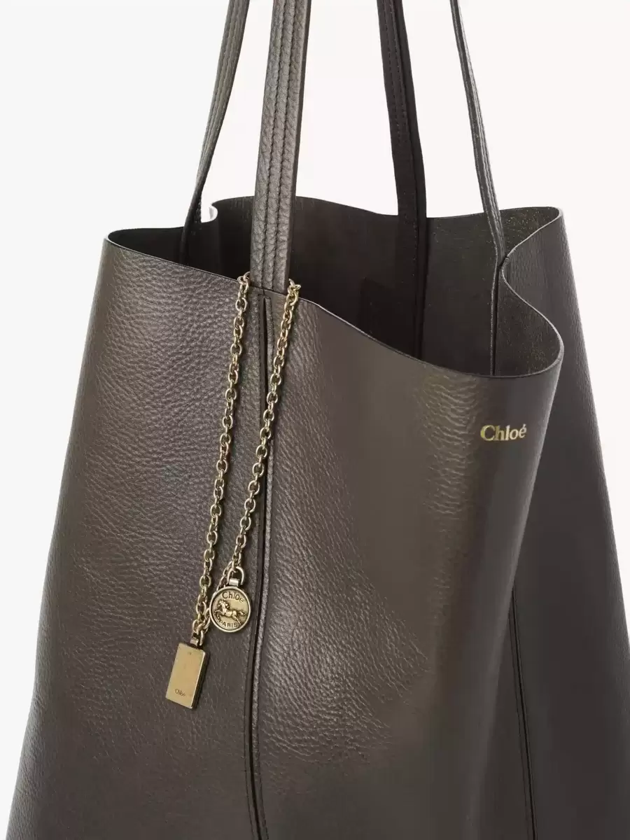 Tillverkad av glänsande, narvat nötskinn, har den stora Chloé Spin-tygväskan en minimalistisk silhuett med grafiska linjer. En dinglande kedja pryder Maisons signaturmedaljer Chloé och hästmedaljer.