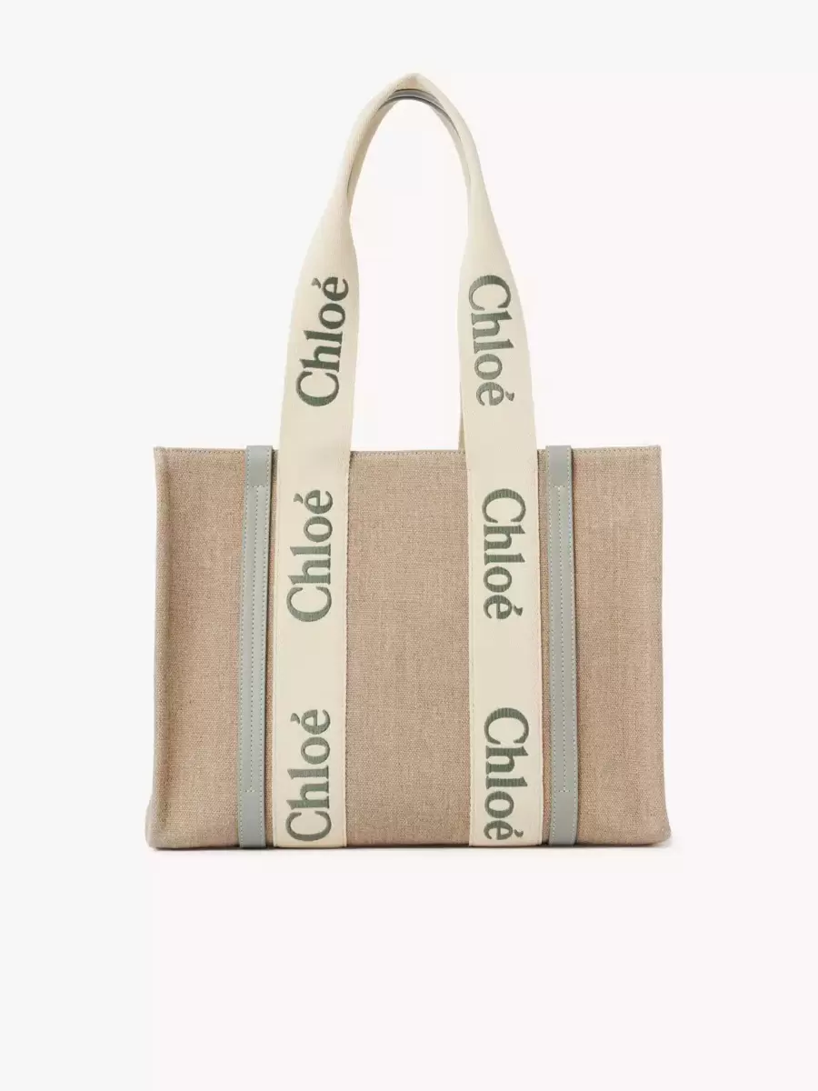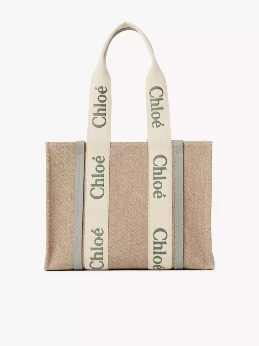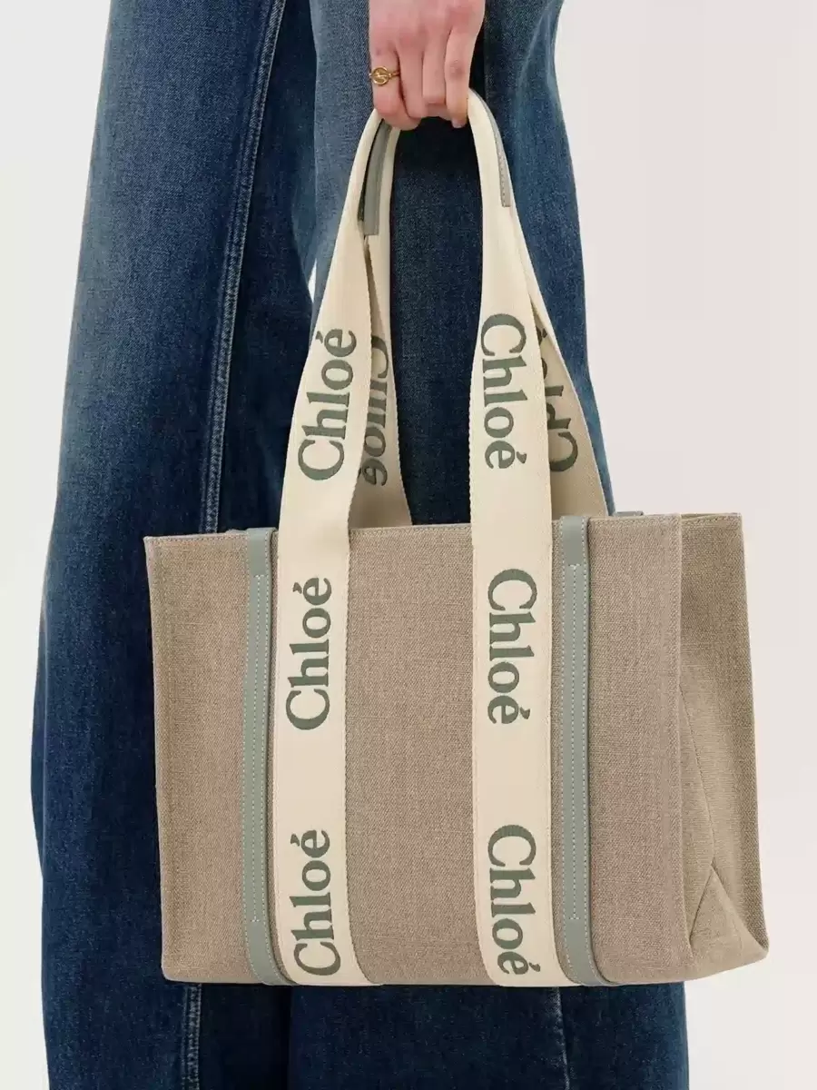 Woody-tygväska i linnecanvas, kalvskinn och vävband med Chloé-logotypbroderi.