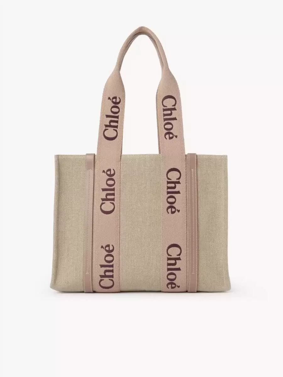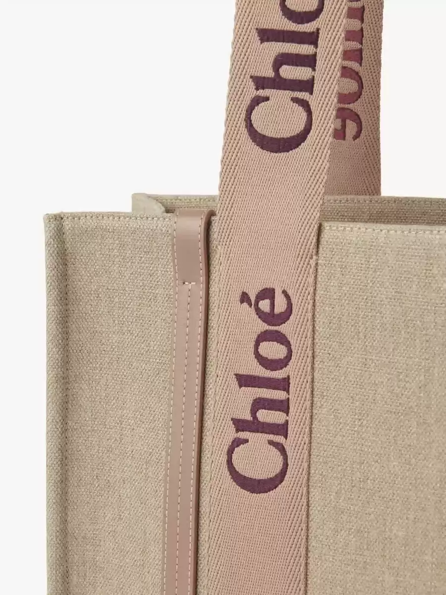 Woody-tygväska i linnecanvas, kalvskinn och vävband med Chloé-logotypbroderi.