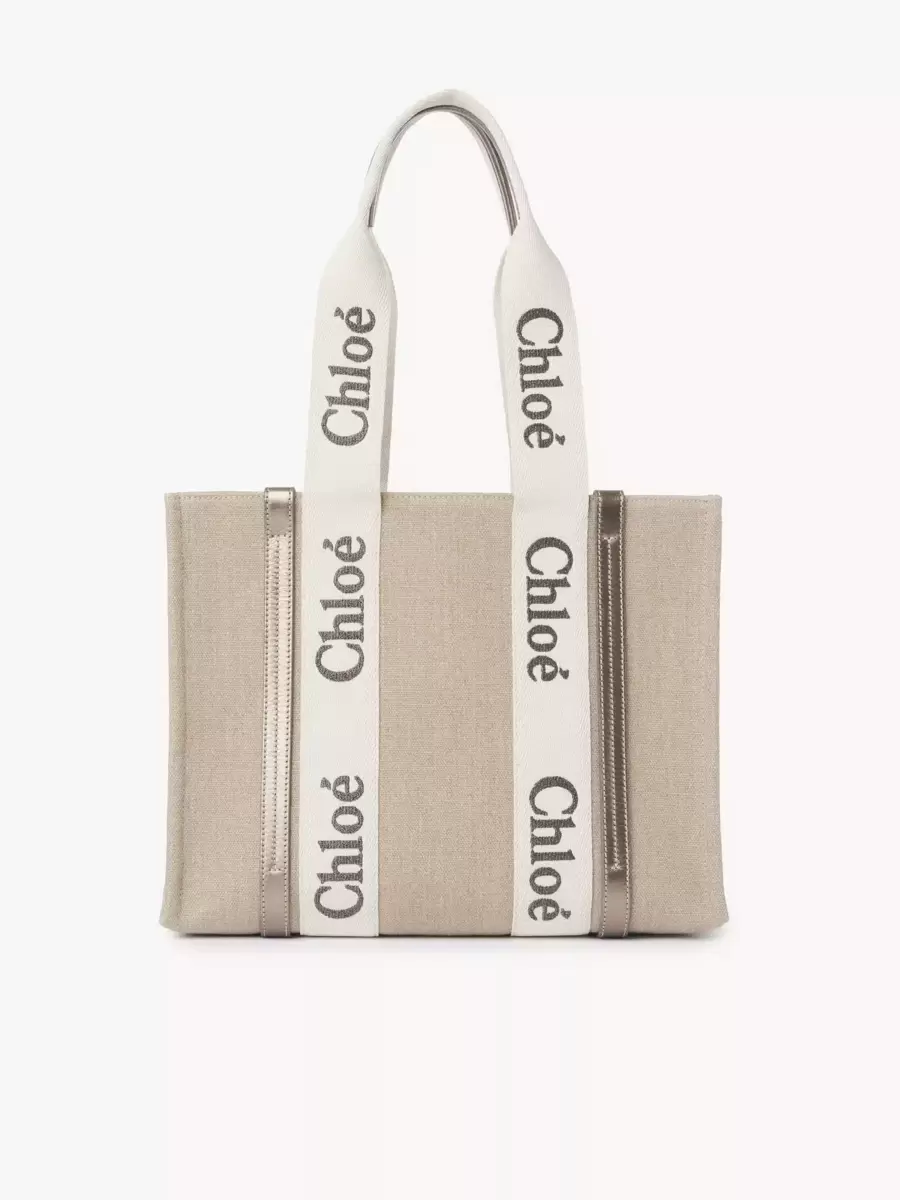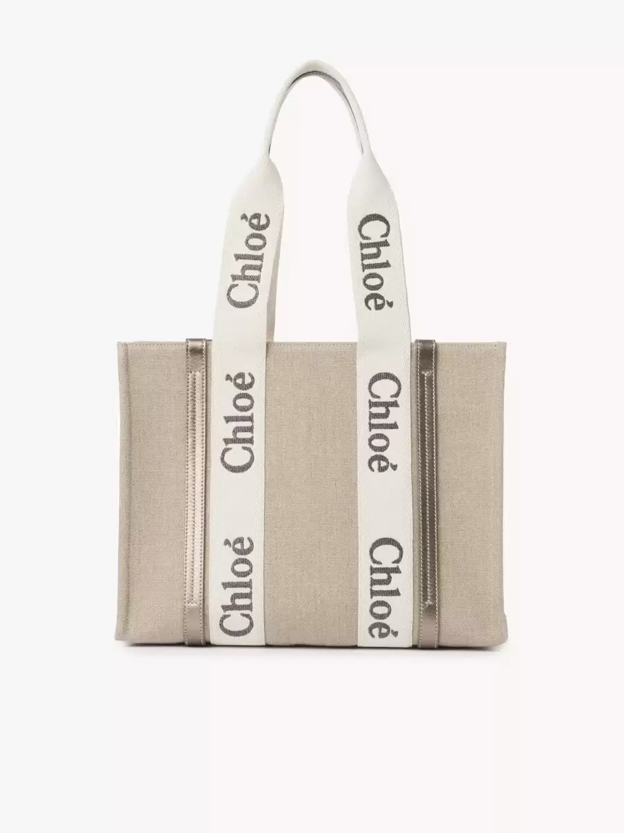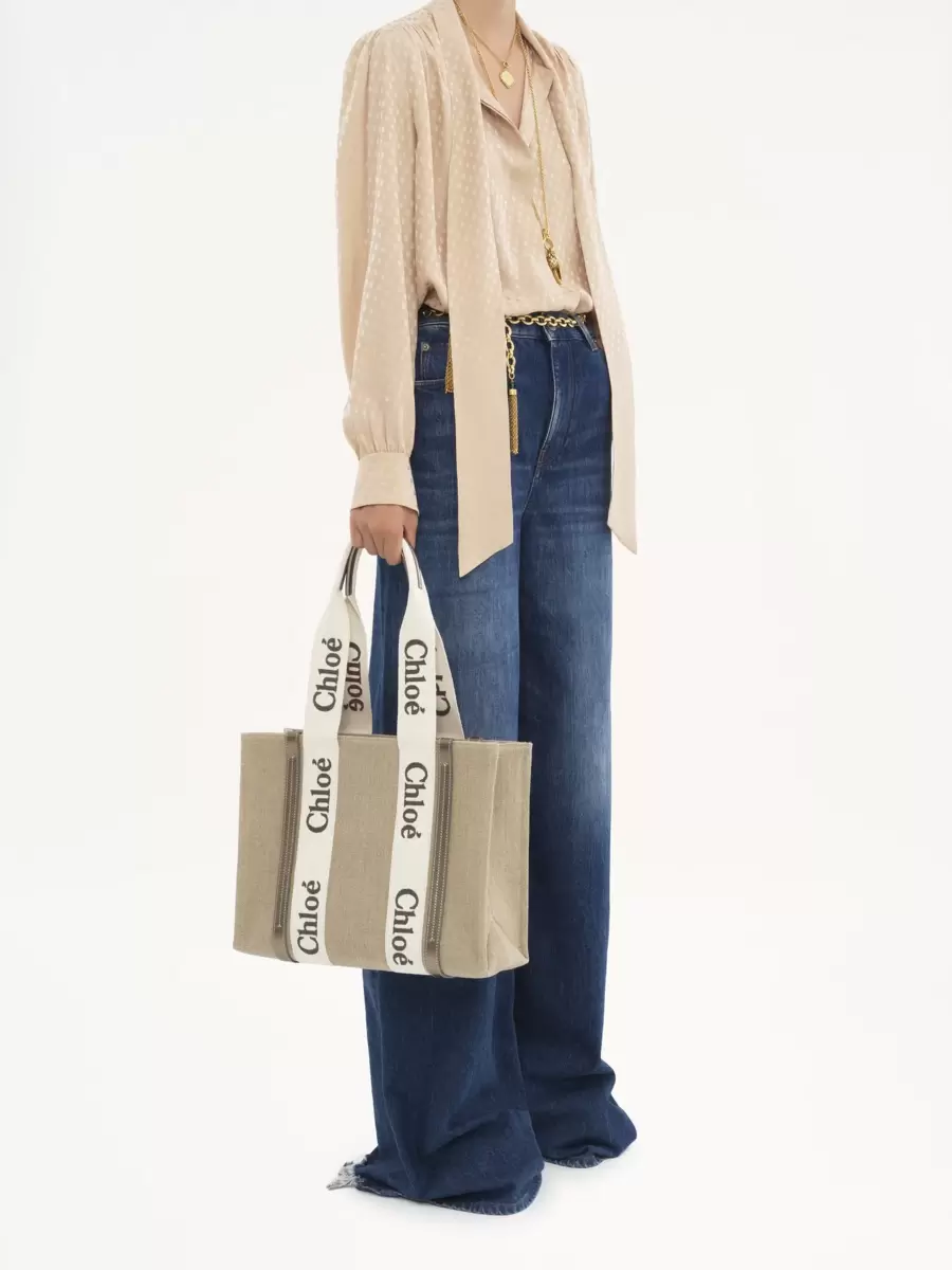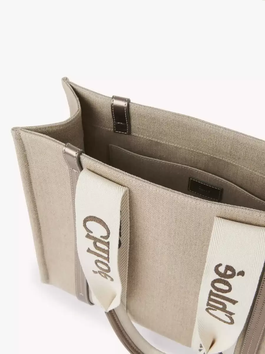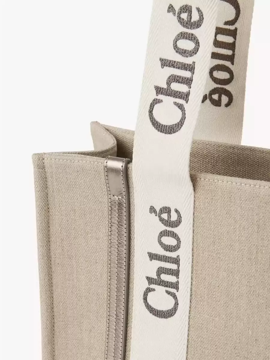 Denna Woody-tygväska är tillverkad av linnecanvas, framhävd av kontrasterande vertikala ränder i metalliserat kalvskinn och signaturcanvasband broderade med Chloé-logotypen. Bär den på axeln eller i handen med de dubbla handtagen.
