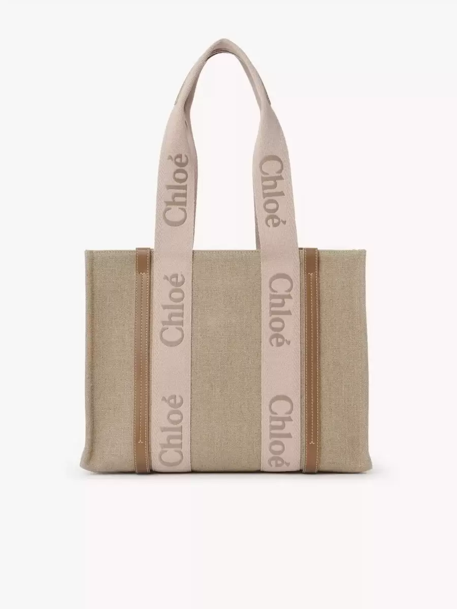 Toteväska i linnecanvas, kalvskinn och vävband med Chloé-logotypbroderi